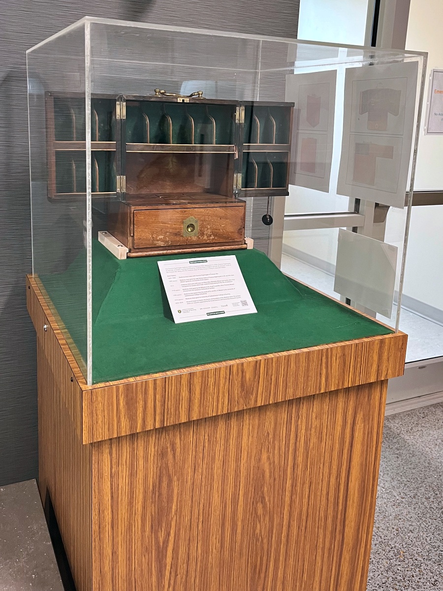 The Nightingale medicine chest has been in many locations over the years, but the five-foot display case is currently located in the Health Sciences Building E-Wing 4th floor.
