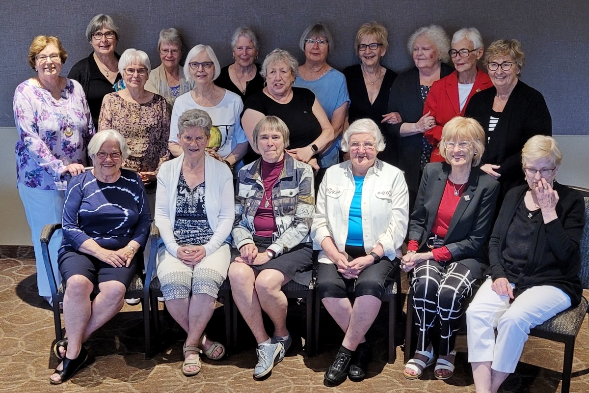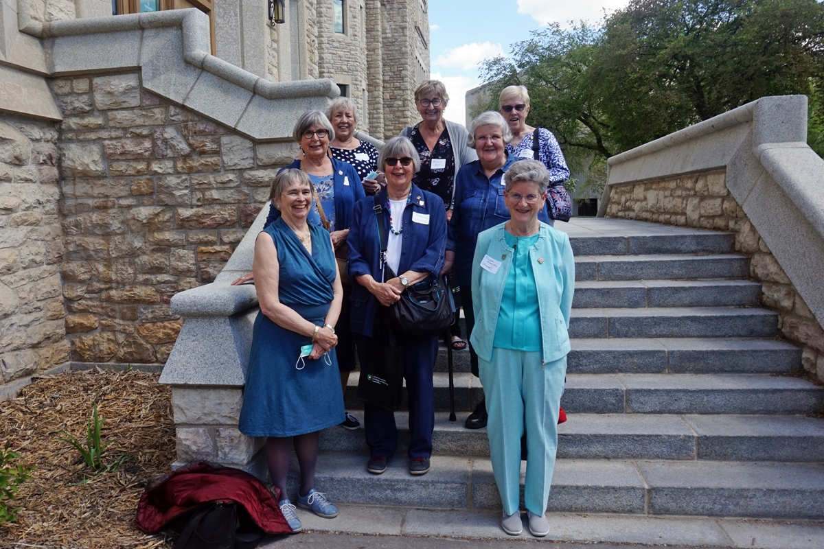 eight female members of the 1967 degree class smiling for a photo outside of the Health Science Building on the USask campus in Saskatoon