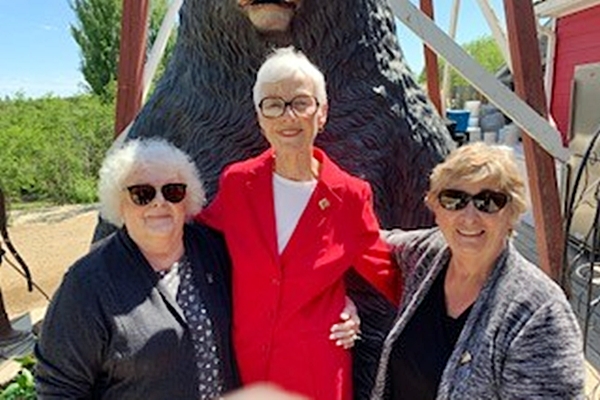 three female members of 1967 degree class posing in front of a bear statue at the Berry Barn in Saskatoon