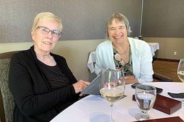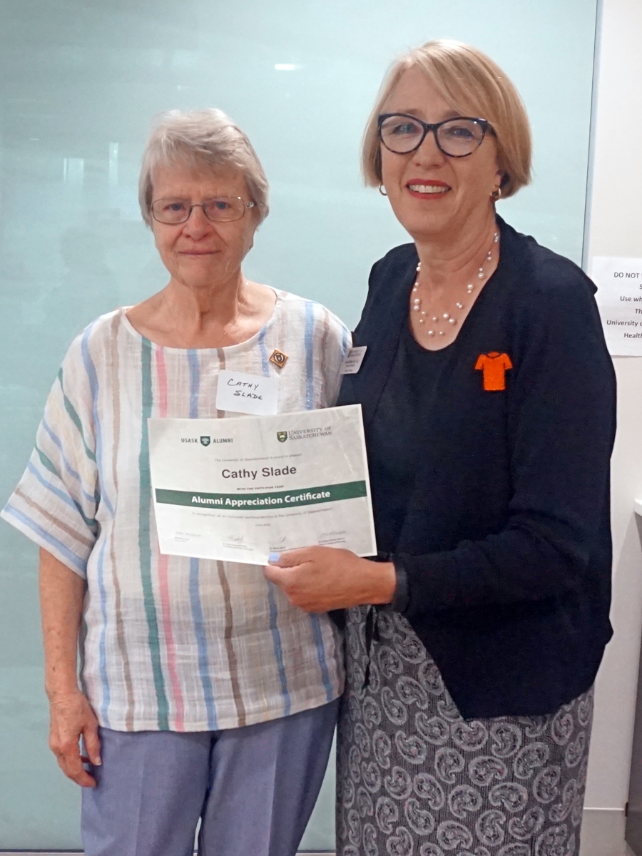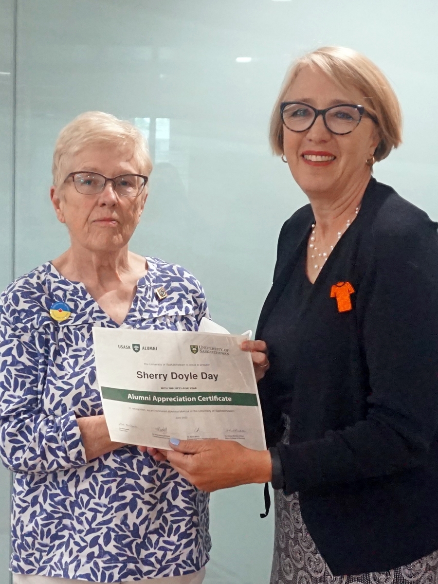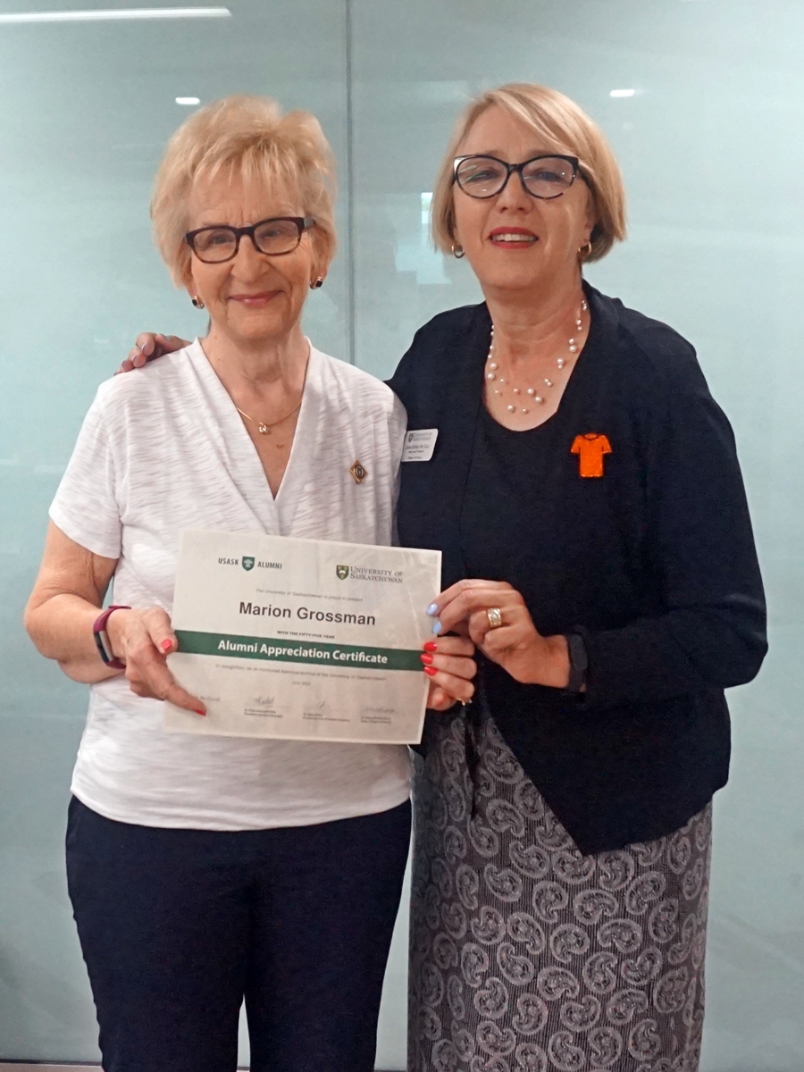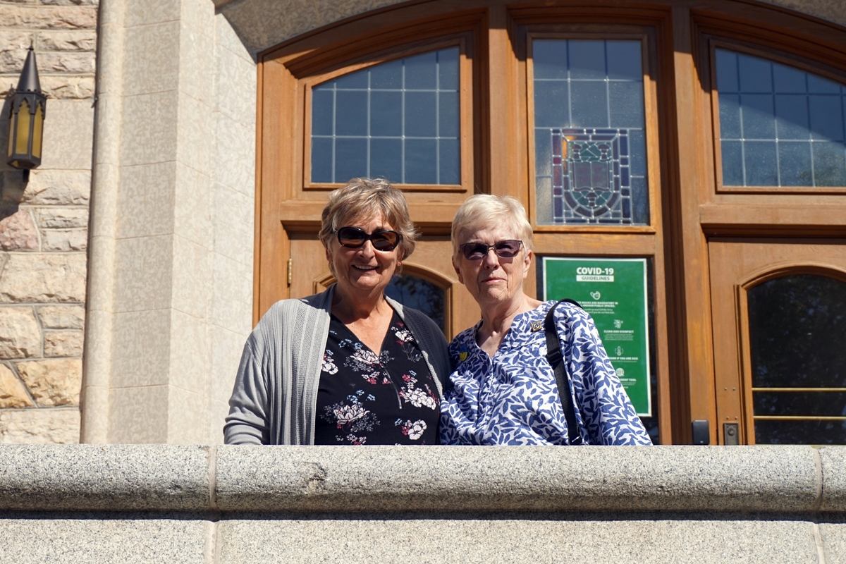 Two female members of the 1967 degree class, outside of the USask Health Science Building in Saskatoon