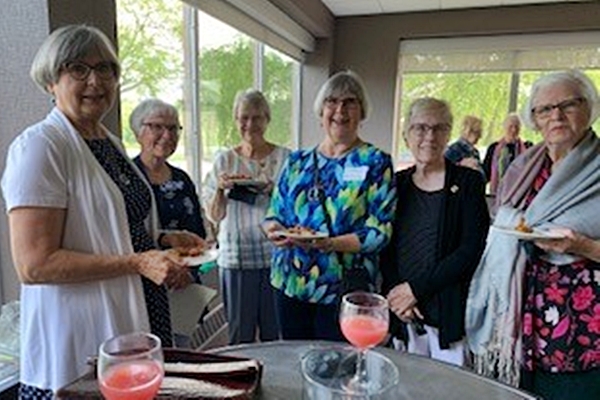 members of the 1967 degree class standing in a semi-circle smiling at the camera holding plates of pastries