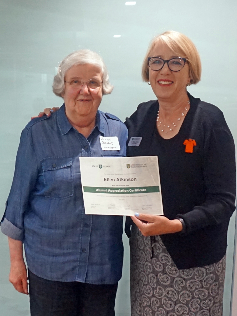 Ellen Atkinson and Solina Richter, dean of the College of Nursing smiling for a photo, holding an Alumni Appreciation Certificate