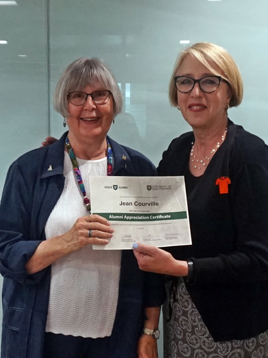 Jean Courville and Solina Richter, dean of the College of Nursing, smiling for a photo holding an Alumni Appreciation Certificate
