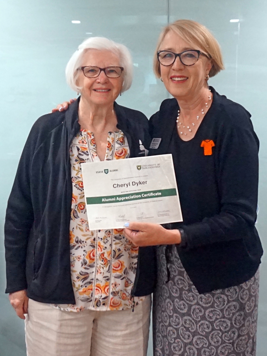 Cheryl Dyker and Solina Richter, dean of the College of Nursing, smiling for a photo, holding an Alumni Appreciation Certificate