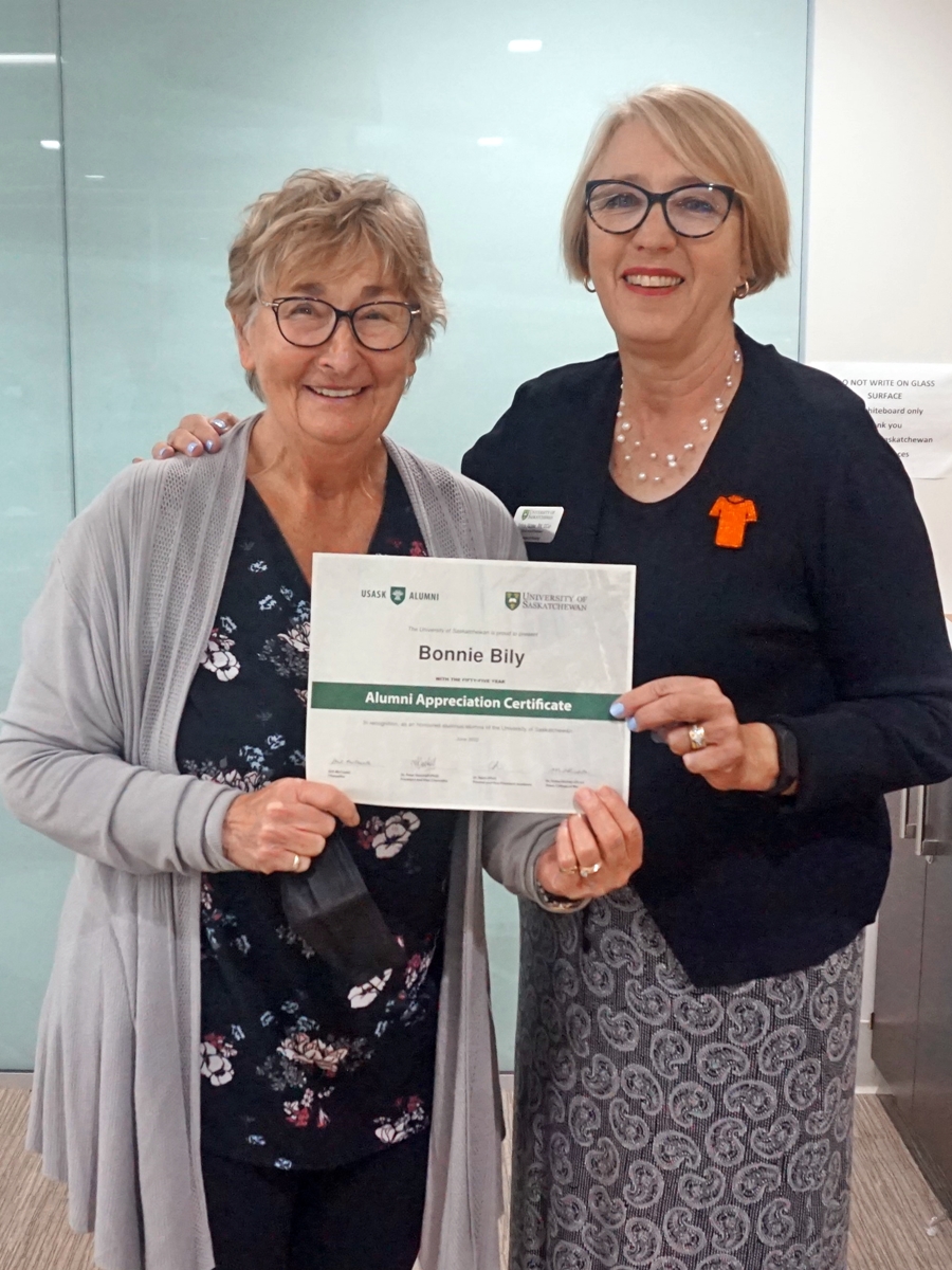 Bonnie Bily and Solina Richter, dean of the College of Nursing, smiling for a photo and holding an Alumni Appreciation Certificate