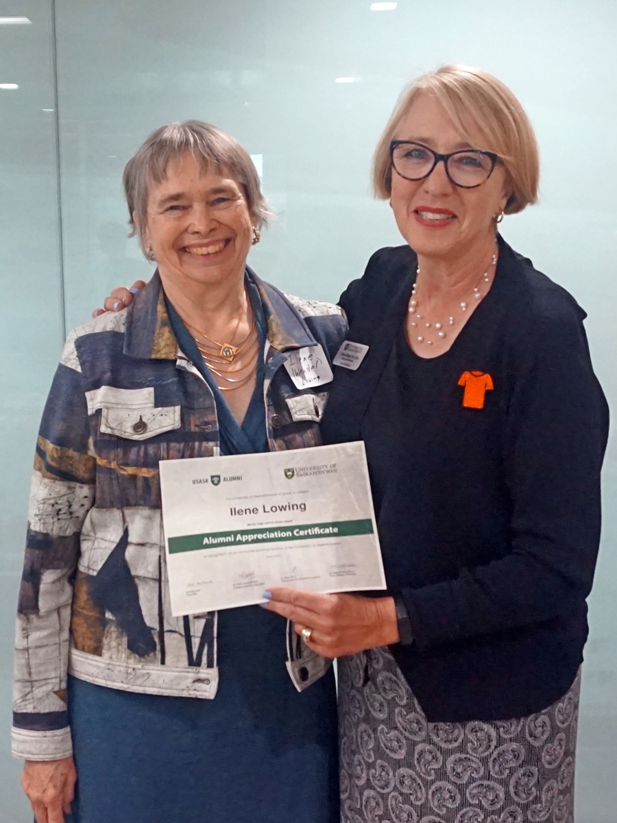 Ilene Lowing and Solina Richter, dean of the College of Nursing, smiling for a photo and holding an Alumni Appreciation Certificate