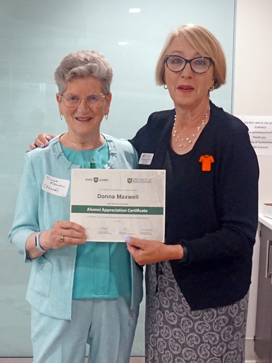 Donna Maxwell and Solina Richter, dean of the College of Nursing, smiling for a photo holding an Alumni Appreciation Certificate