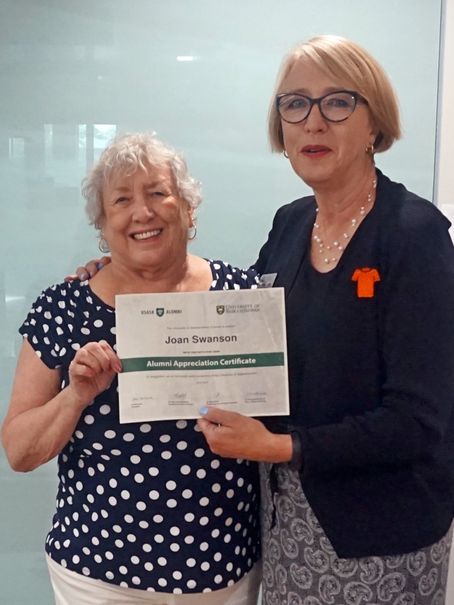 Joan Swanson and Solina Richter, dean of the College of Nursing, smiling for a picture and holding an Alumni Appreciation Certificate