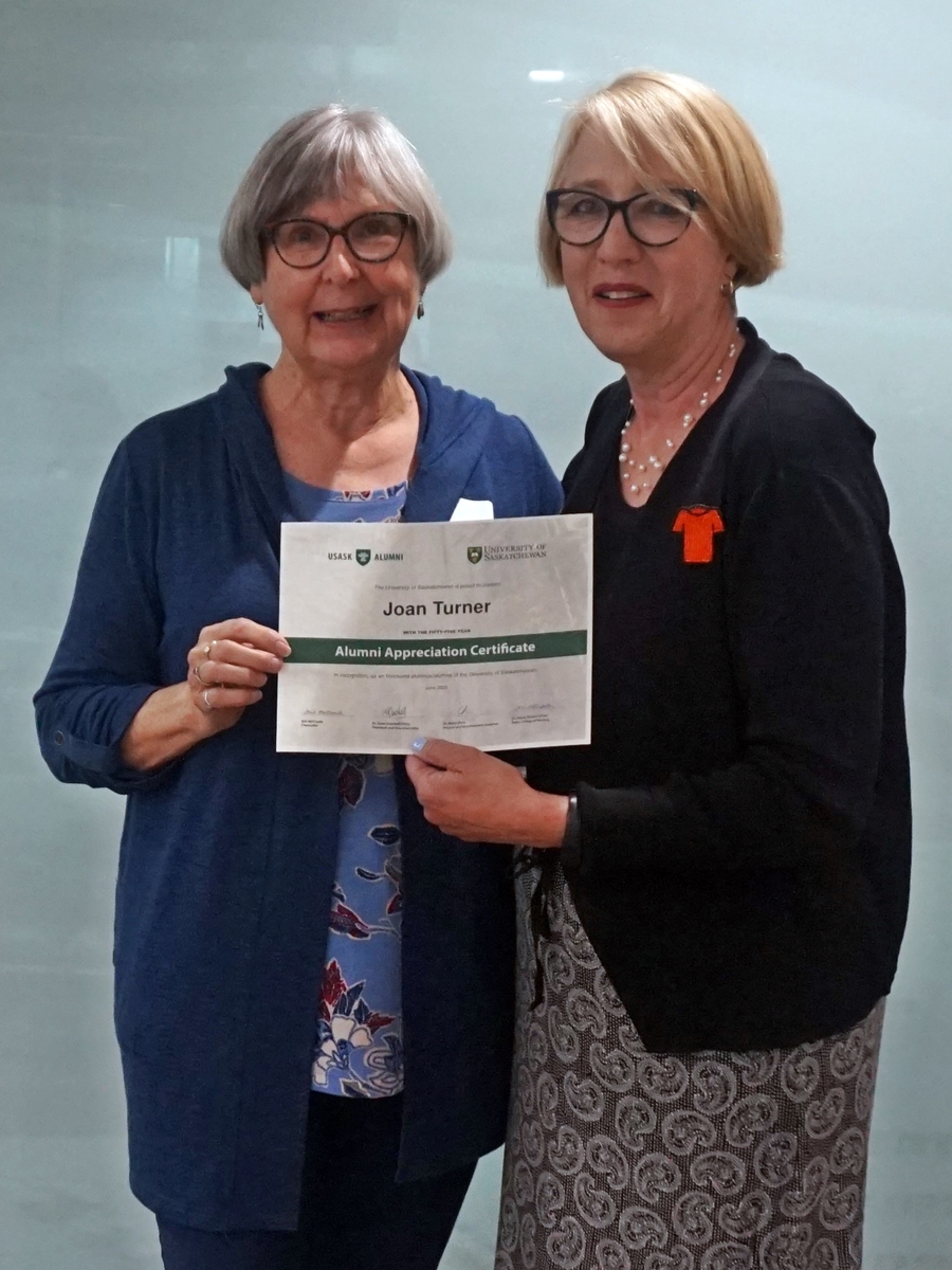 Joan Turner and Solina Richter, dean of the College of Nursing, smiling for a photo holding an Alumni Appreciation Certificate