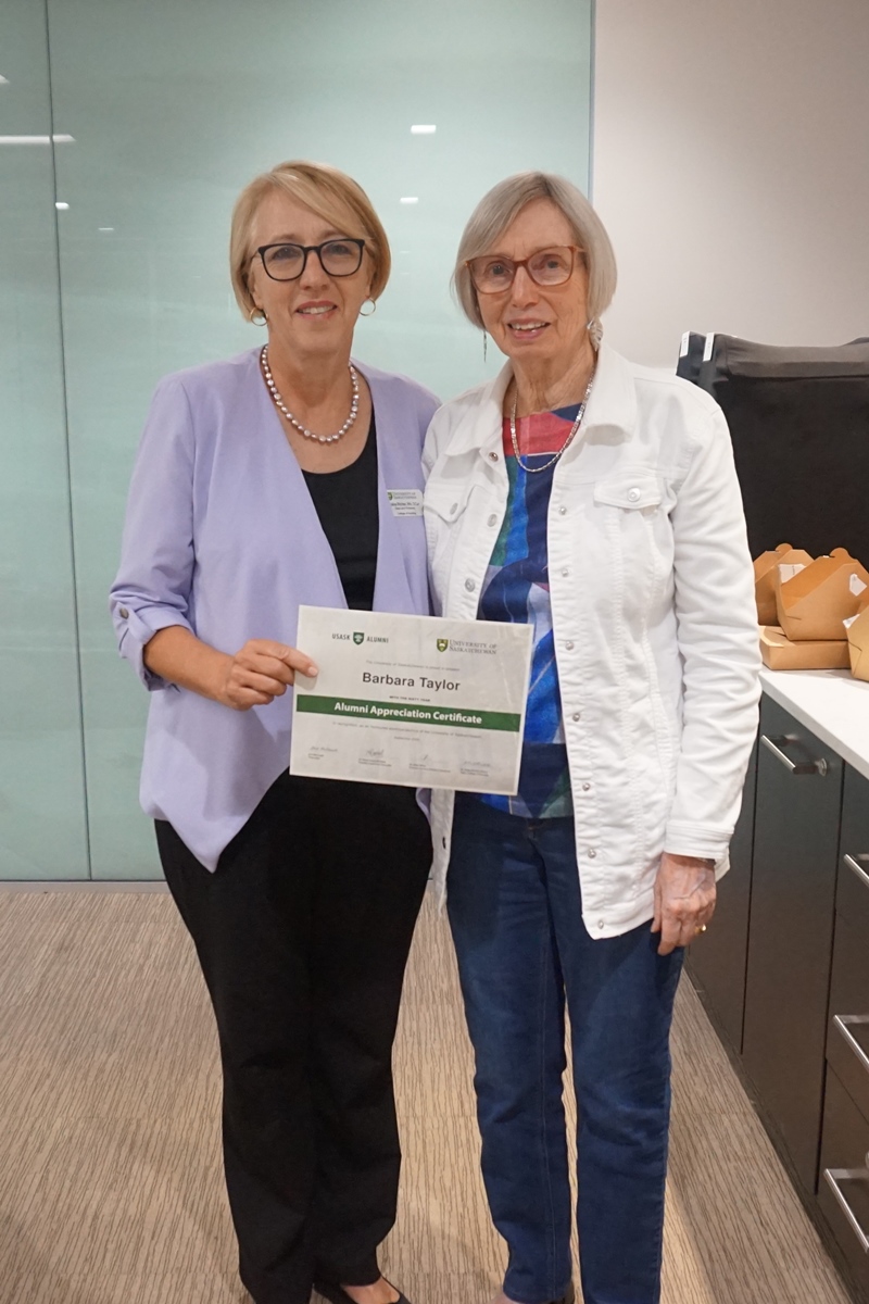 Barbara Taylor and Solina Richter, dean of the College of Nursing, smiling for a photo and holding an Alumni Appreciation Certificate