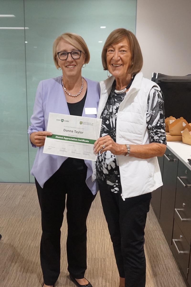 Donna Taylor and Solina Richter, dean of the College of Nursing, smiling for a photo and holding an Alumni Appreciation Certificate