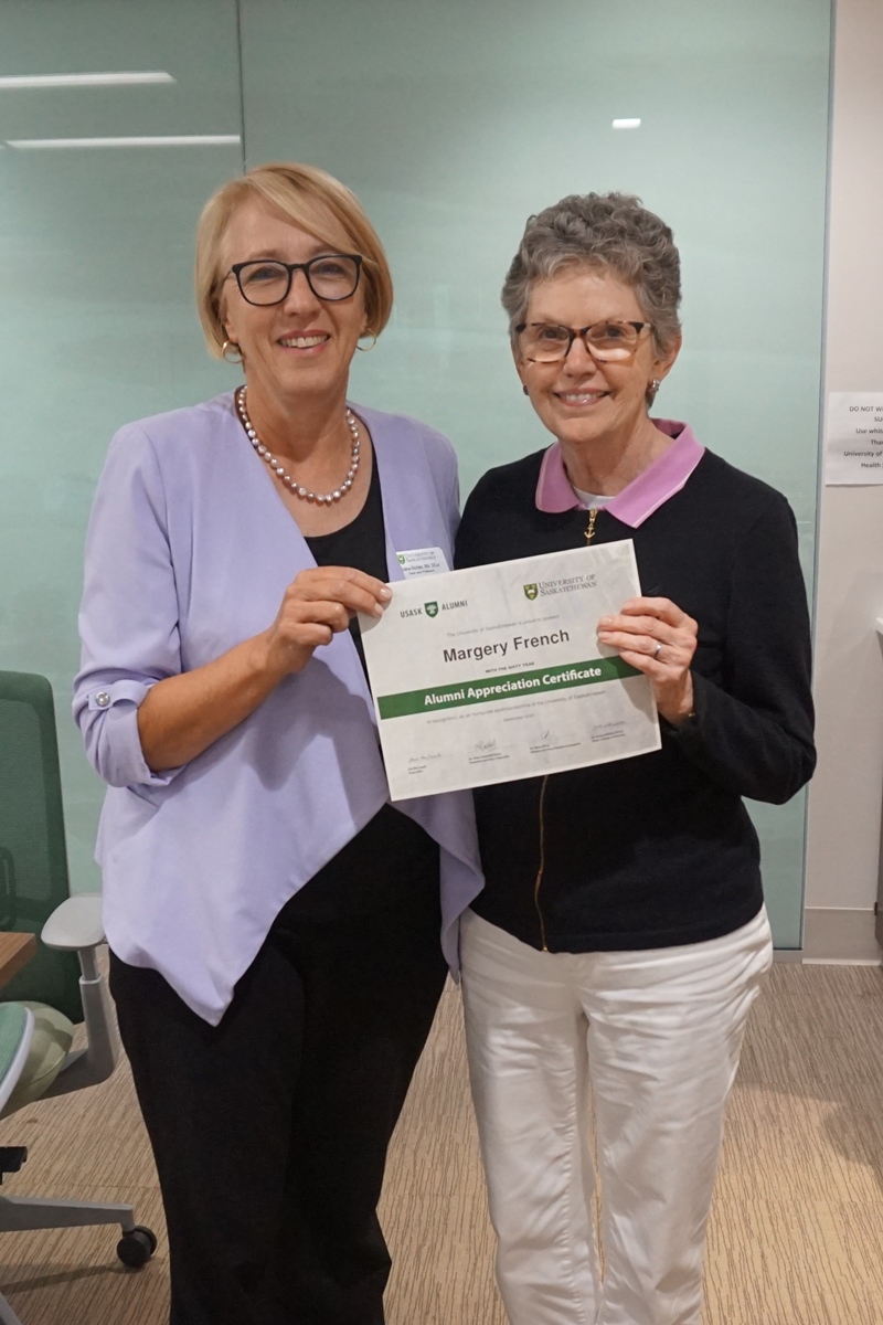 Margery French and Solina Richter, dean of the College of Nursing, smiling for a photo and holding an Alumni Appreciation Certificate