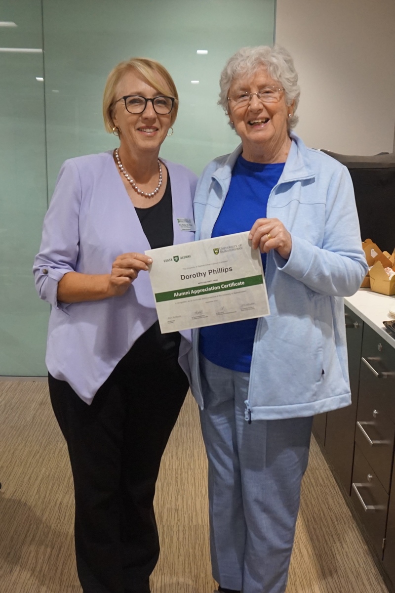 Dorothy Phillips and Solina Richter, dean of the College of Nursing, smiling for a photo and holding an Alumni Appreciation Certificate
