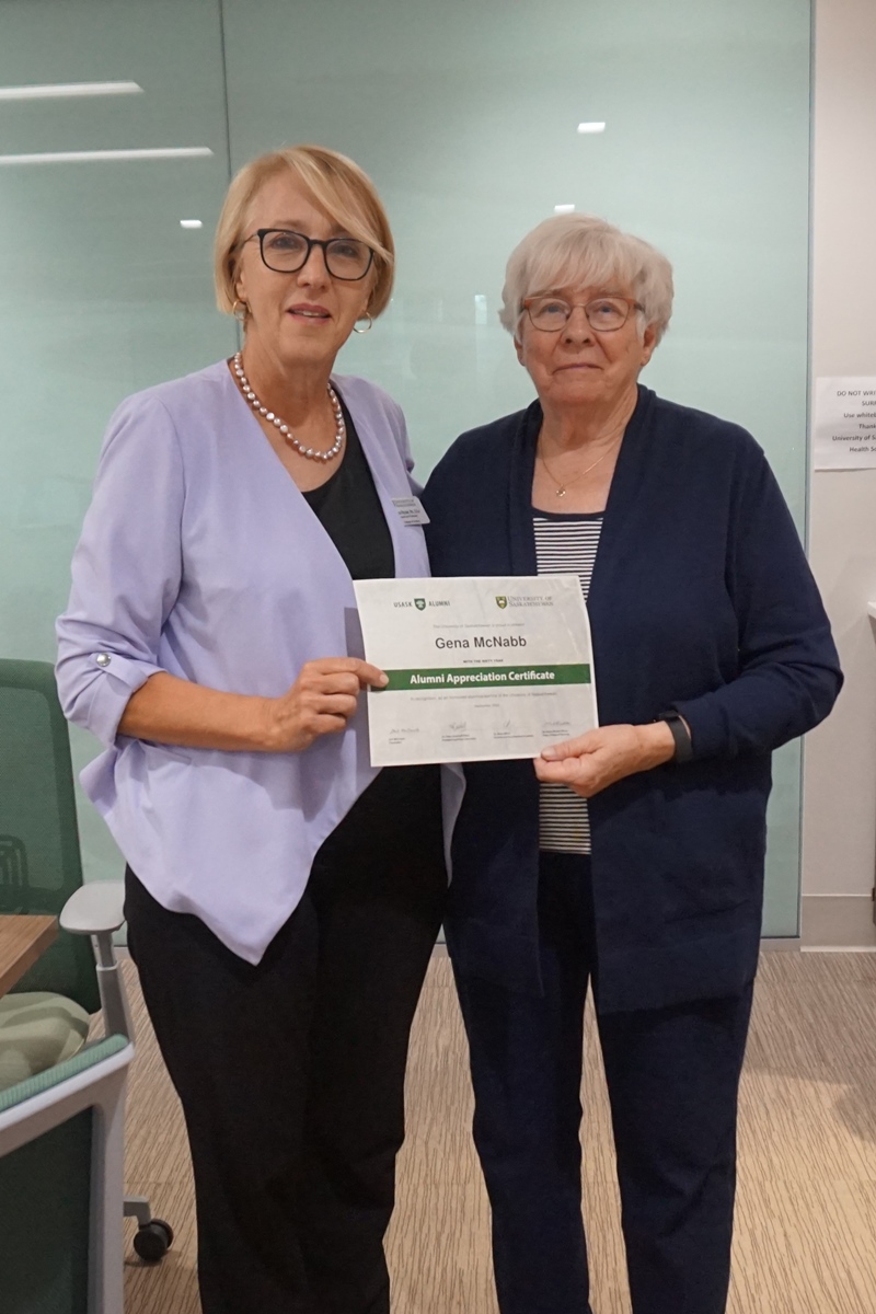 Gena McNabb and Solina Richter, dean of the College of Nursing, smiling for a photo and holding an Alumni Appreciation Certificate