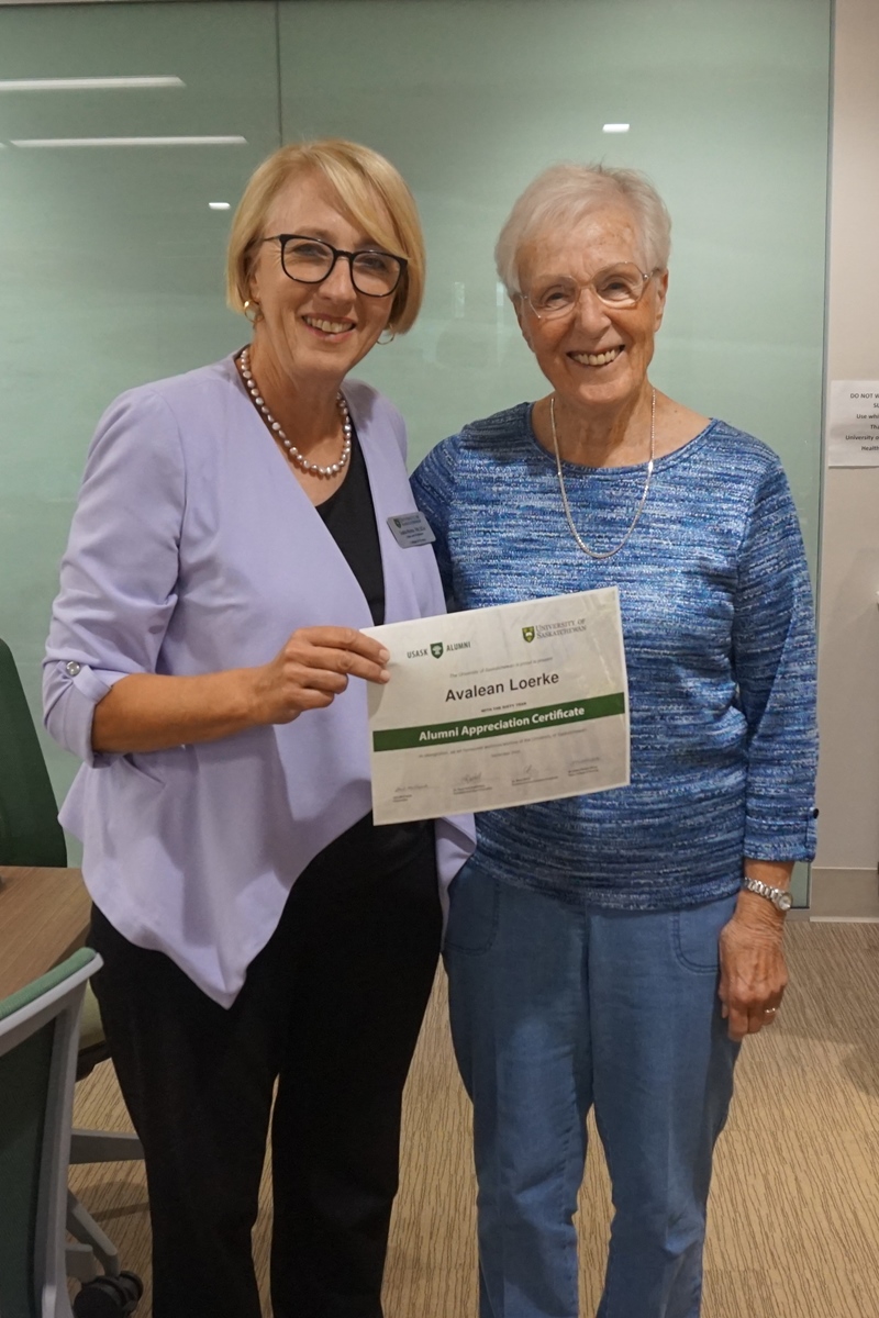 Avalean Loerke and Solina Richter, dean of the College of Nursing, smiling for a photo and holding an Alumni Appreciation Certificate
