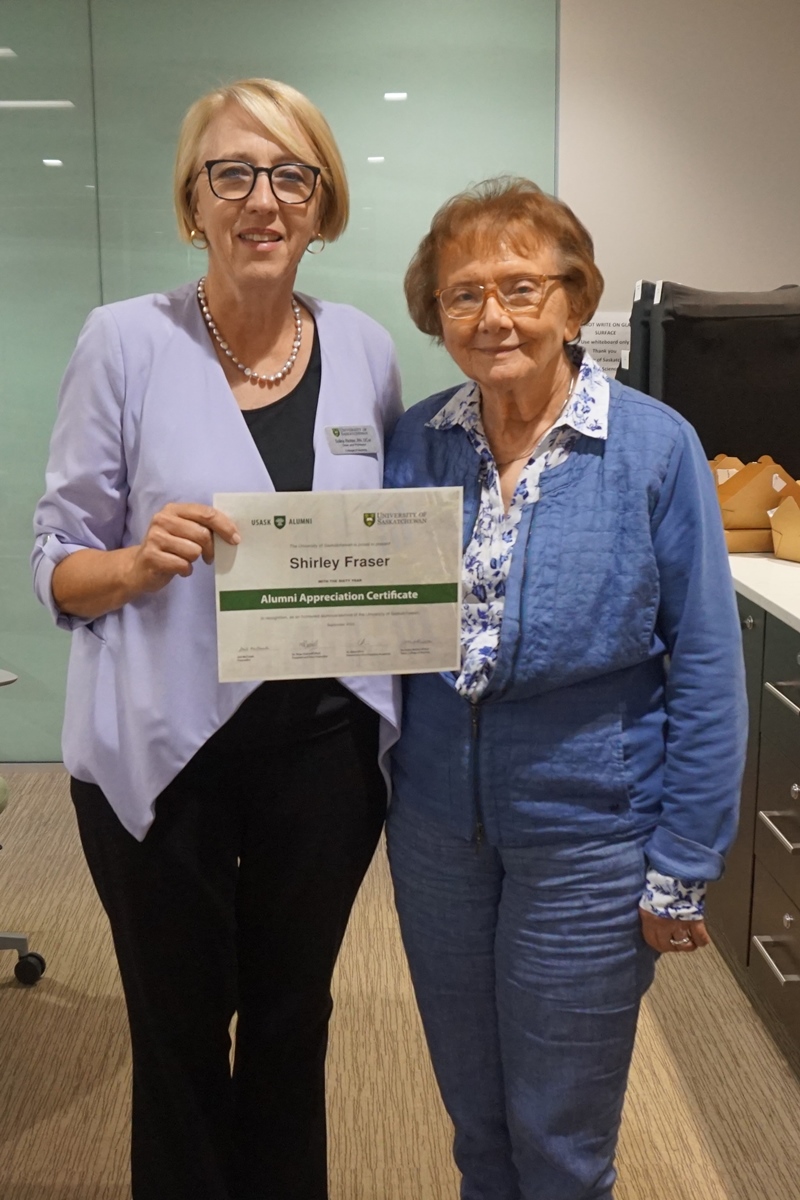 Shirley Fraser and Solina Richter, dean of the College of Nursing, smiling for a photo and holding an Alumni Appreciation Certificate
