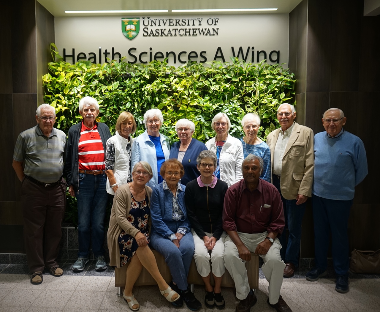 eight members of the 1962 degree class, joined by five spouses, smiling for a photo infront of a wall of plants