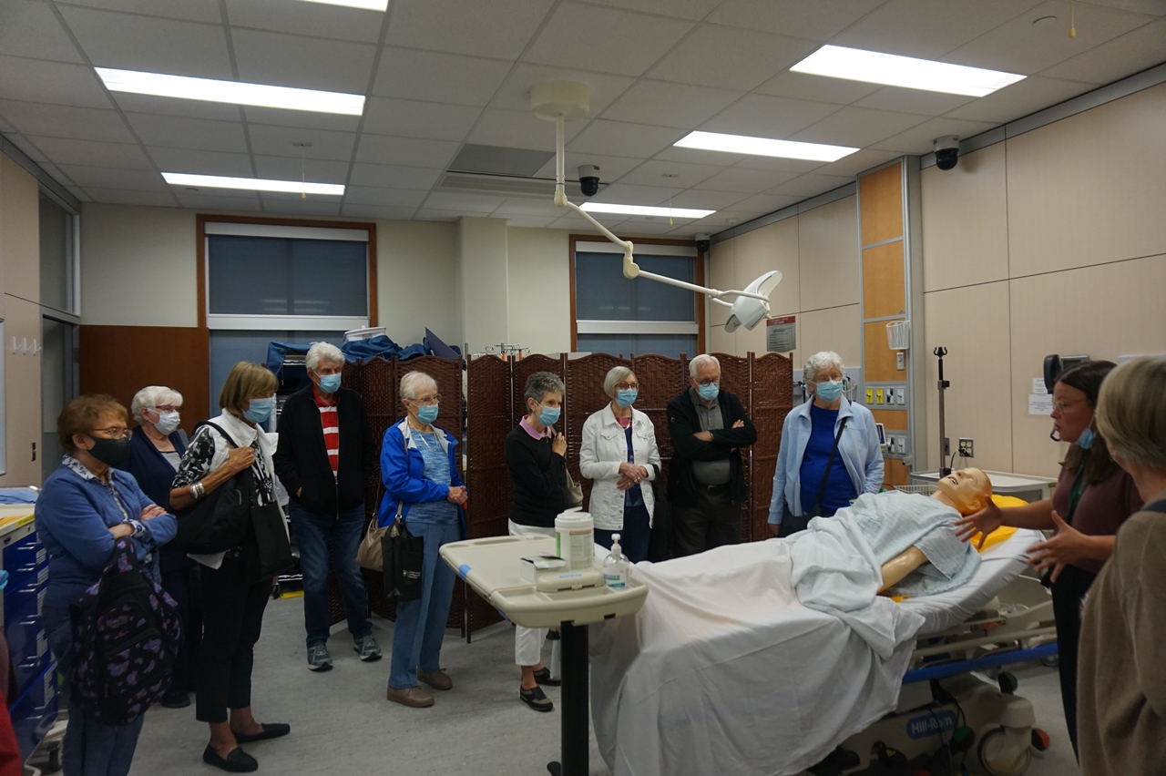 a group of 1962 degree class alumni wearing N95 masks, standing around a hospital bed, listening to an instructor give a presentation