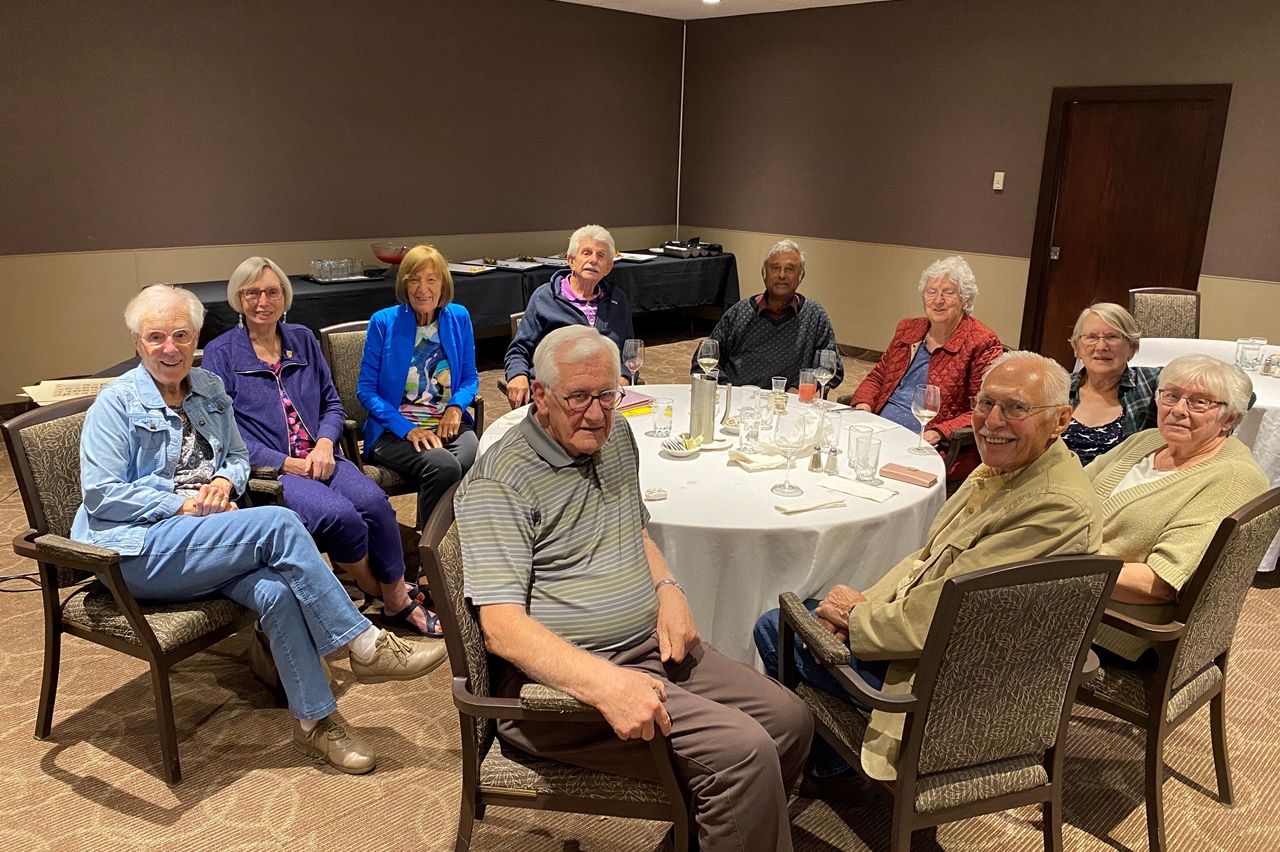 a group of 1962 degree class alumni sitting around a circular table smiling for a photo