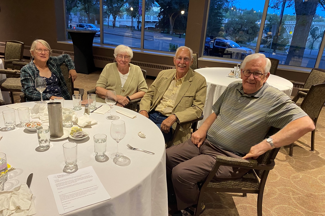 two male and two female members of the 1962 degree class alumni, sitting at a circular table smiling for a photo
