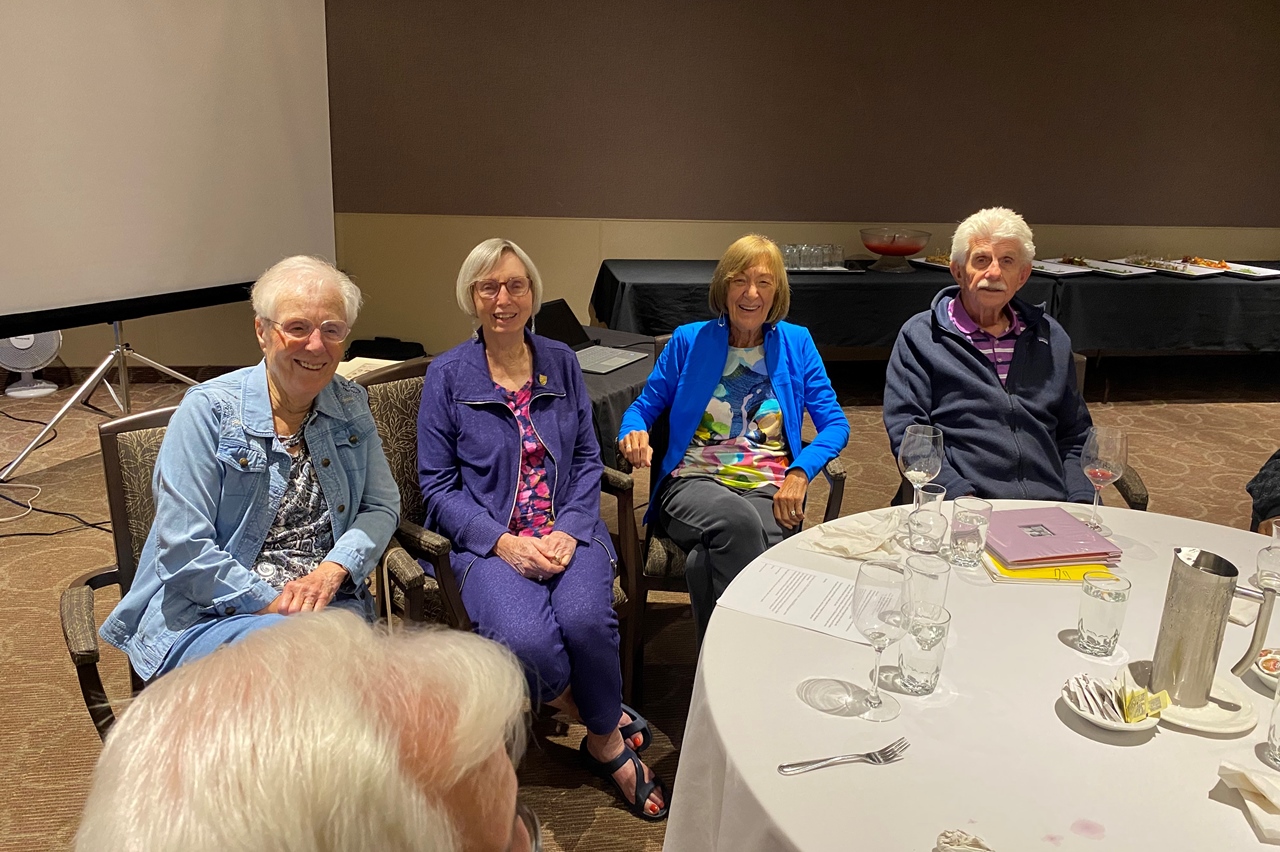 four members of the 1962 degree class alumni, sitting at a circular table smiling for a photo