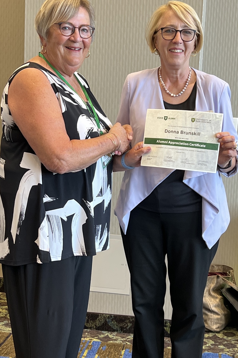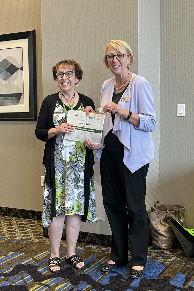 Donna Brunskill and Solina Richter, dean of the College of Nursing, smiling for a photo and holding an Alumni Appreciation Certificate