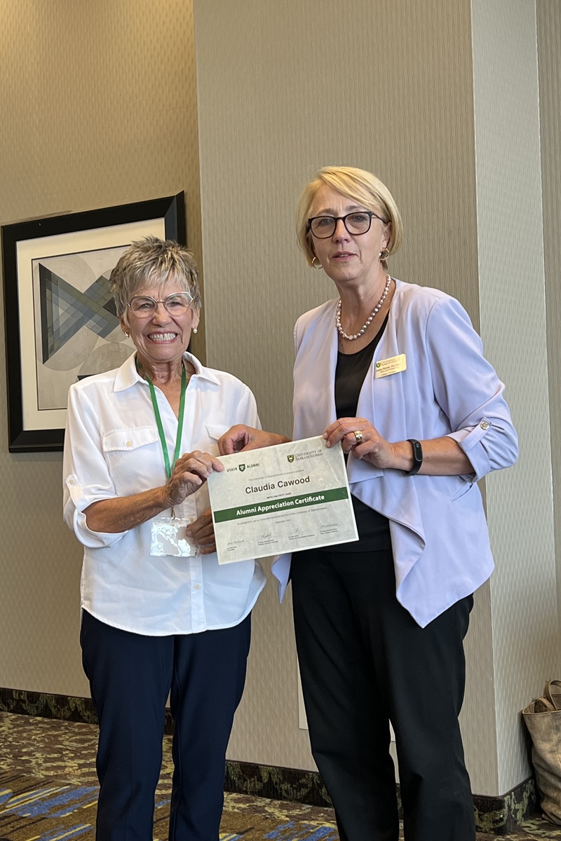 Claudia Cawood and Solina Richter, dean of the College of Nursing, smiling for a photo and holding an Alumni Appreciation Certificate