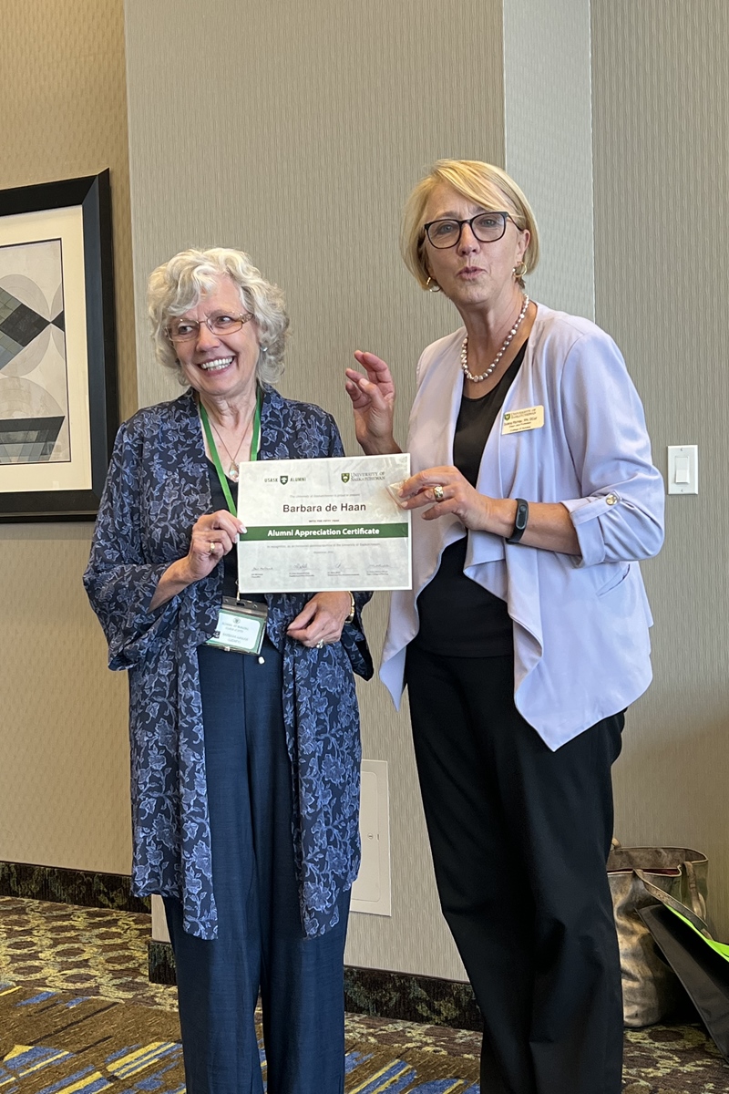 Barbara de Haan and Solina Richter, dean of the College of Nursing, smiling for a photo and holding an Alumni Appreciation Certificate