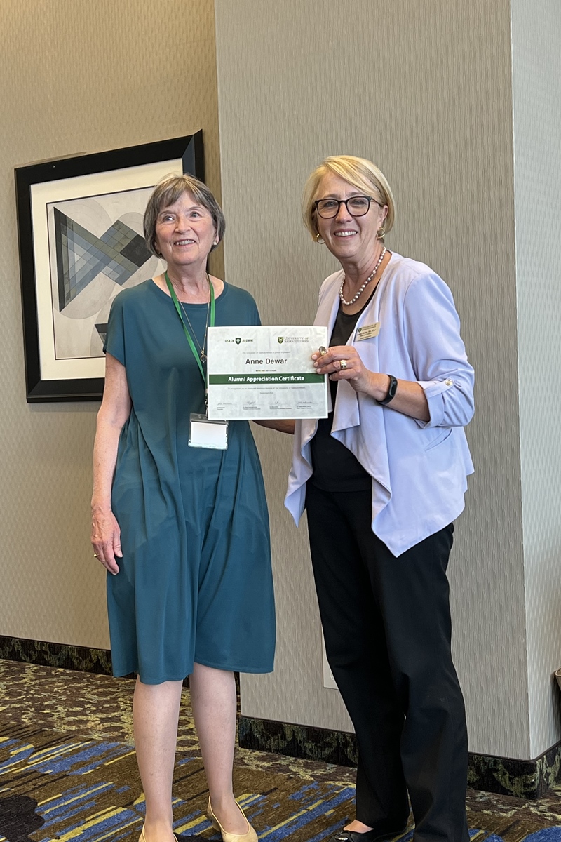 Anne Dewar and Solina Richter, dean of the College of Nursing, smiling for a photo and holding an Alumni Appreciation Certificate