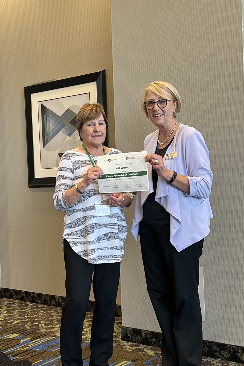 Val Gore and Solina Richter, dean of the College of Nursing, smiling for a photo and holding an Alumni Appreciation Certificate