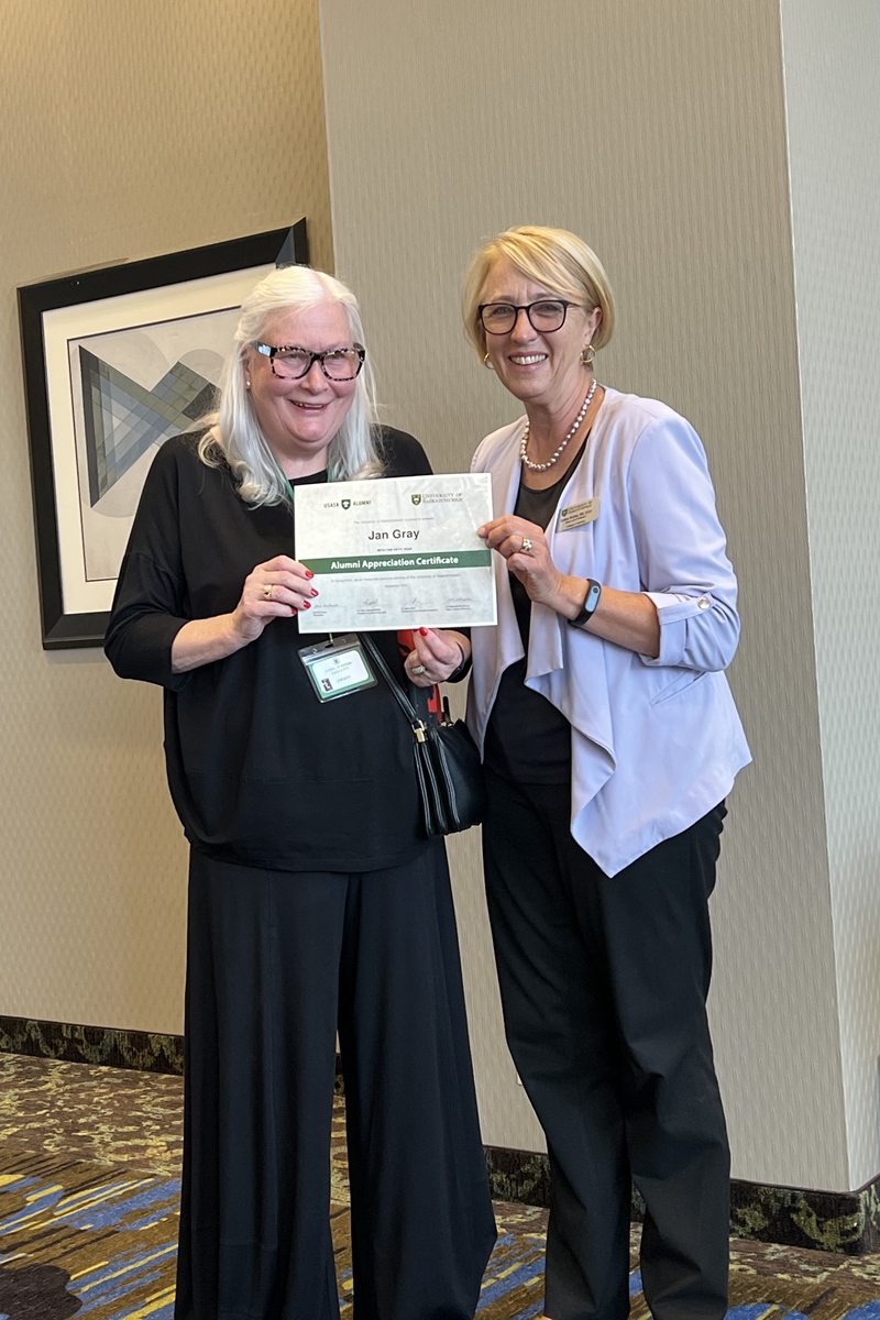 Jan Gray and Solina Richter, dean of the College of Nursing, smiling for a photo and holding an Alumni Appreciation Certificate