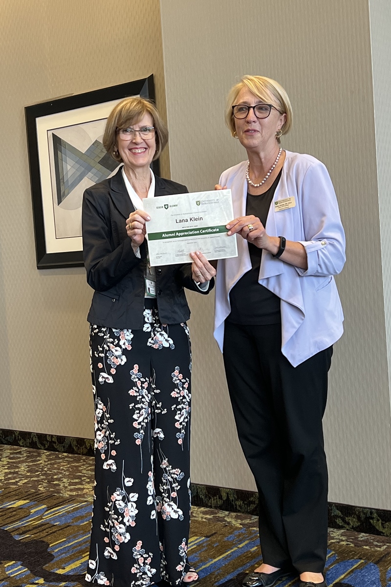 Lana Klein and Solina Richter, dean of the College of Nursing, smiling for a photo and holding an Alumni Appreciation Certificate