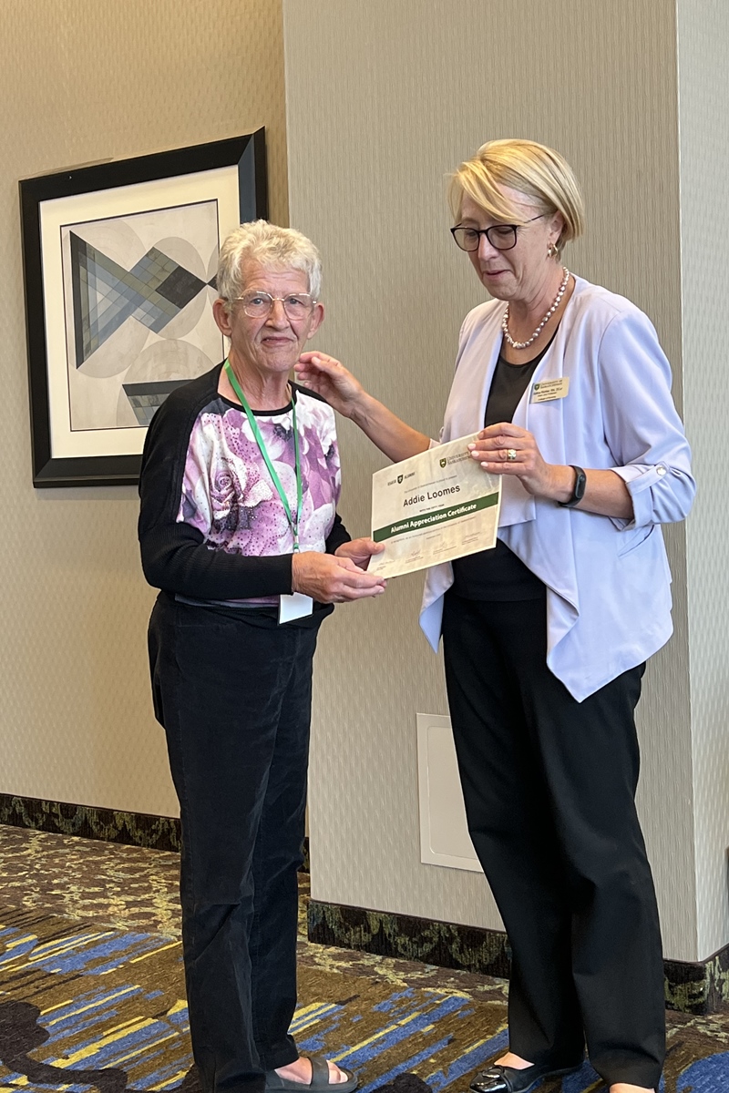 Addie Loomes and Solina Richter, dean of the College of Nursing, smiling for a photo and holding an Alumni Appreciation Certificate