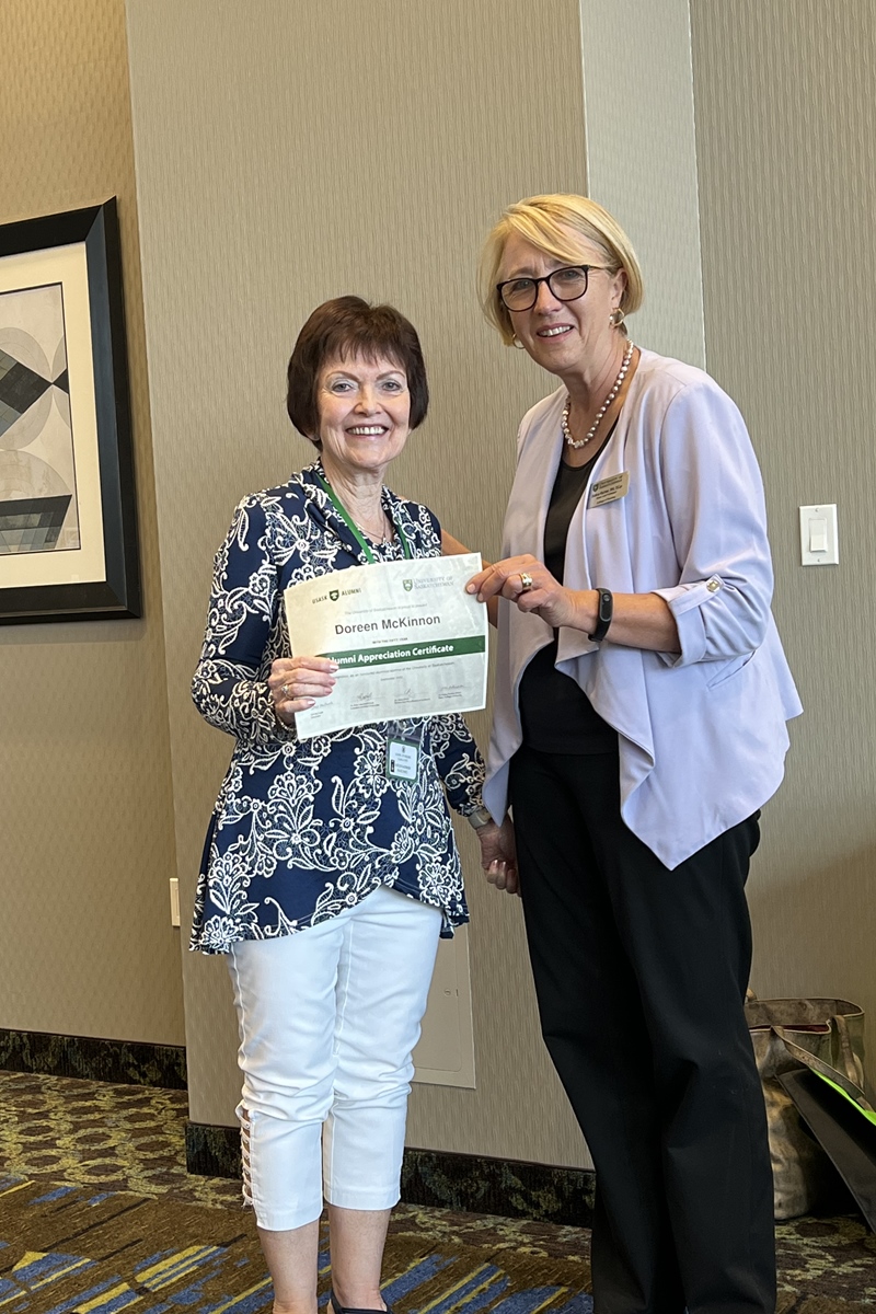 Doreen McKinnon and Solina Richter, dean of the College of Nursing, smiling for a photo and holding an Alumni Appreciation Certificate