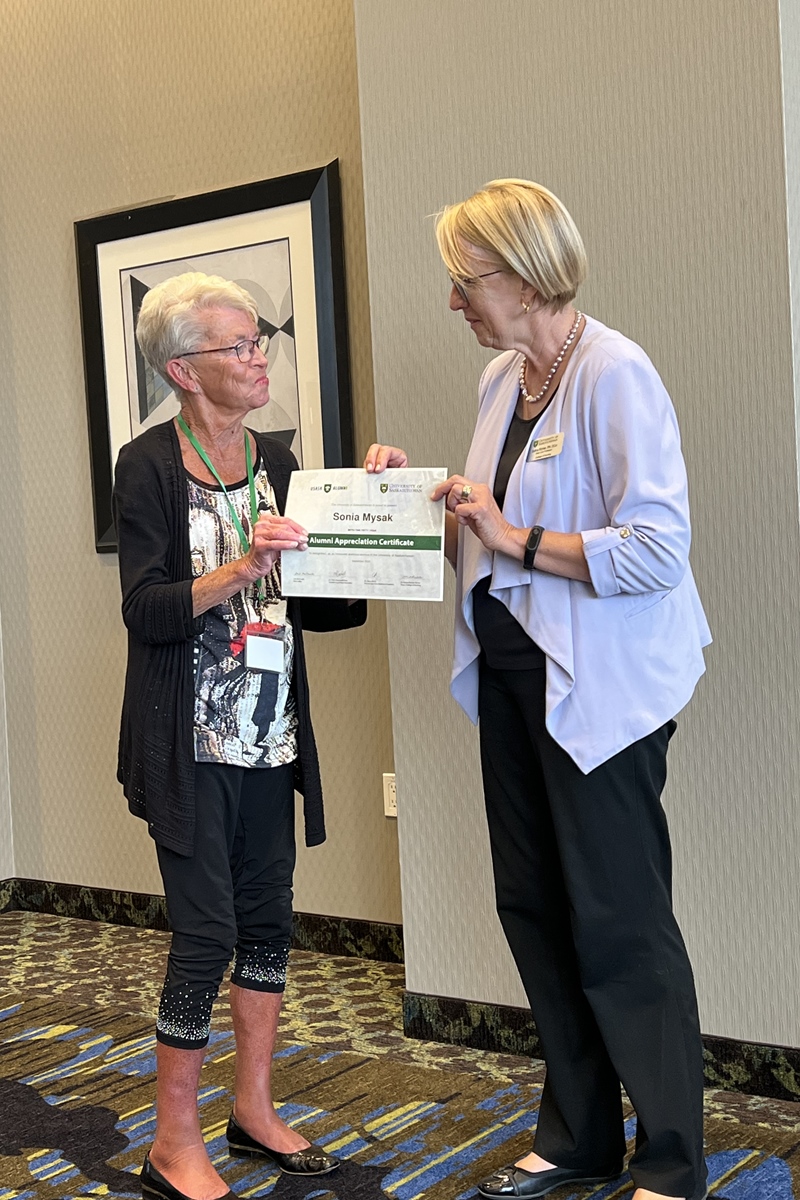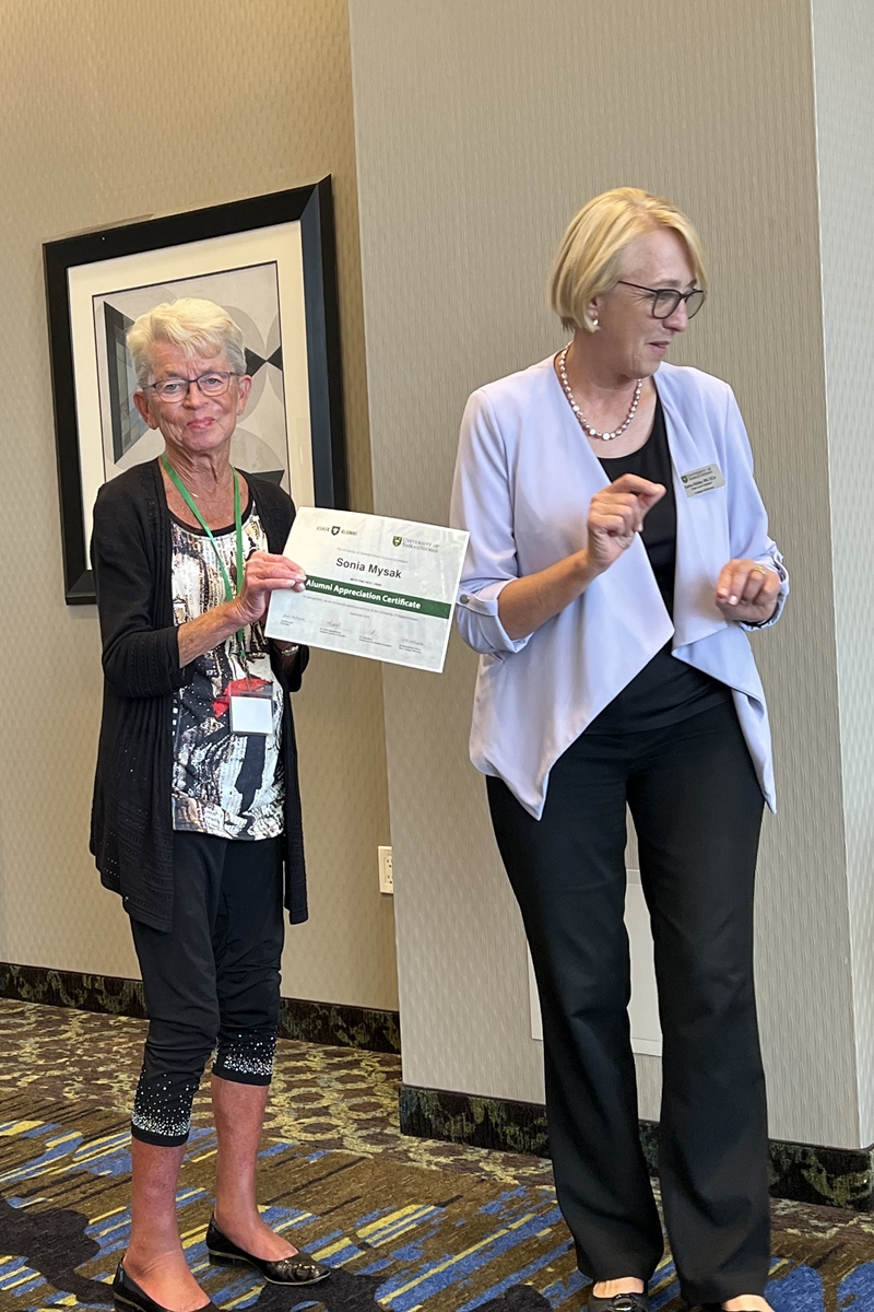 Sonia Mysak  and Solina Richter, dean of the College of Nursing, standing beside eachother preparing to take a photo together holding an Alumni Appreciation Certificate