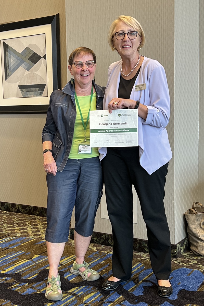 Georgina Normandin and Solina Richter, dean of the College of Nursing, smiling for a photo and holding an Alumni Appreciation Certificate
