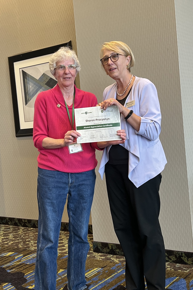 Sharon Procyshyn and Solina Richter, dean of the College of Nursing, smiling for a photo and holding an Alumni Appreciation Certificate