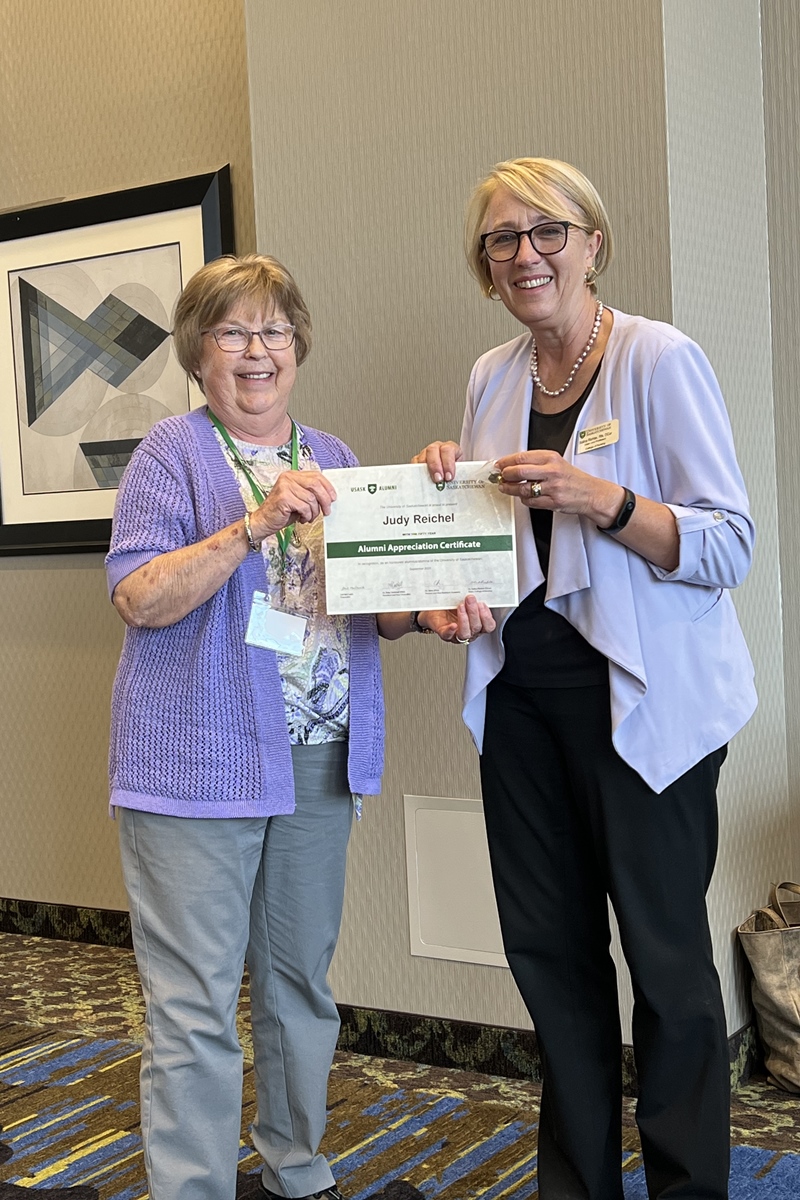 Judy Reichel and Solina Richter, dean of the College of Nursing, smiling for a photo and holding an Alumni Appreciation Certificate