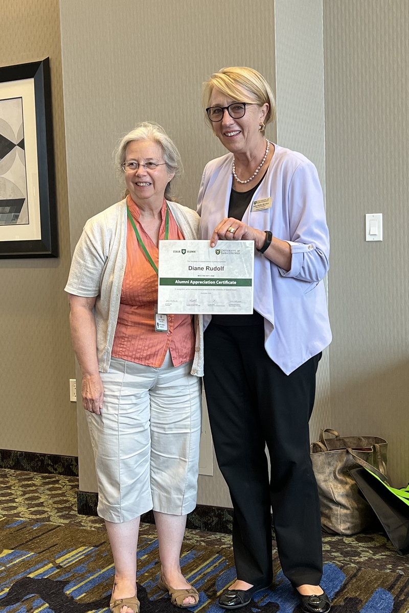 Diane Rudolf and Solina Richter, dean of the College of Nursing, smiling for a photo and holding an Alumni Appreciation Certificate