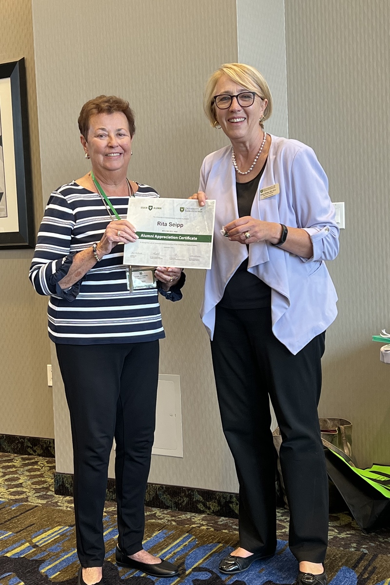 Rita Seipp and Solina Richter, dean of the College of Nursing, smiling for a photo and holding an Alumni Appreciation Certificate
