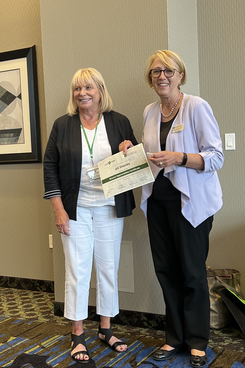 Jill Shanks and Solina Richter, dean of the College of Nursing, smiling for a photo and holding an Alumni Appreciation Certificate