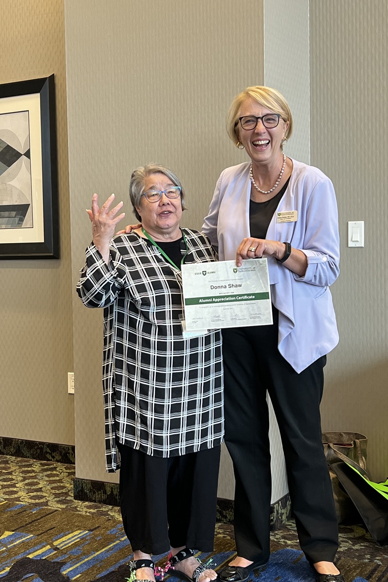 Donna Shaw and Solina Richter, dean of the College of Nursing, laughing and smiling, prepating to take a photo and holding an Alumni Appreciation Certificate