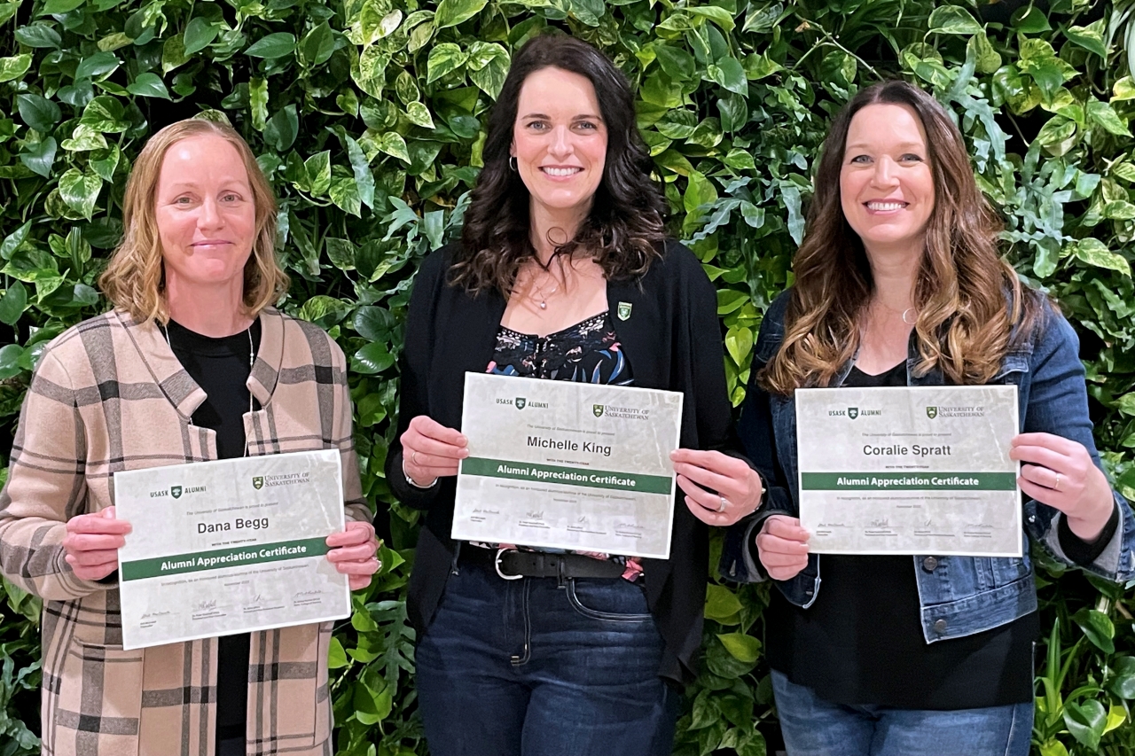 Dana Begg, Michelle King, and Coralie Spratt, smiling in front of a wall of plants, holding their Alumni Appreciation Certificate's
