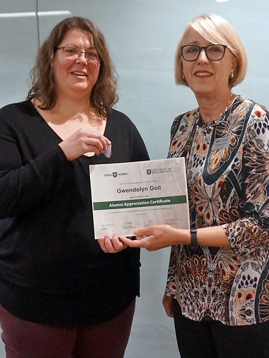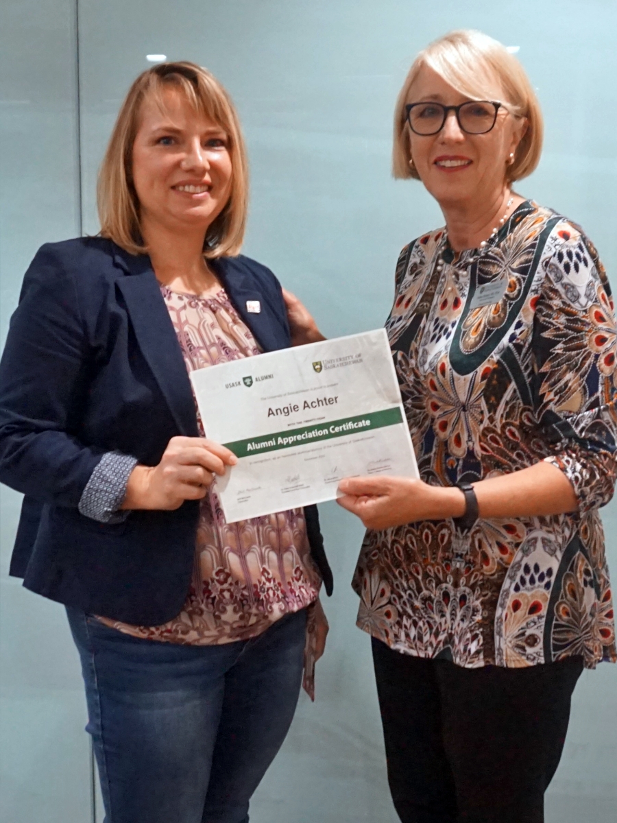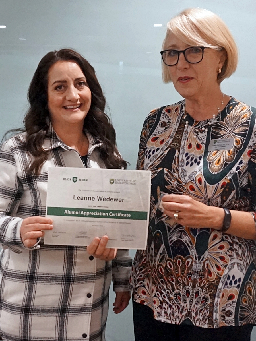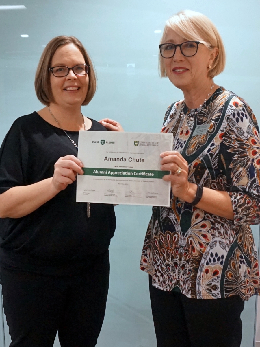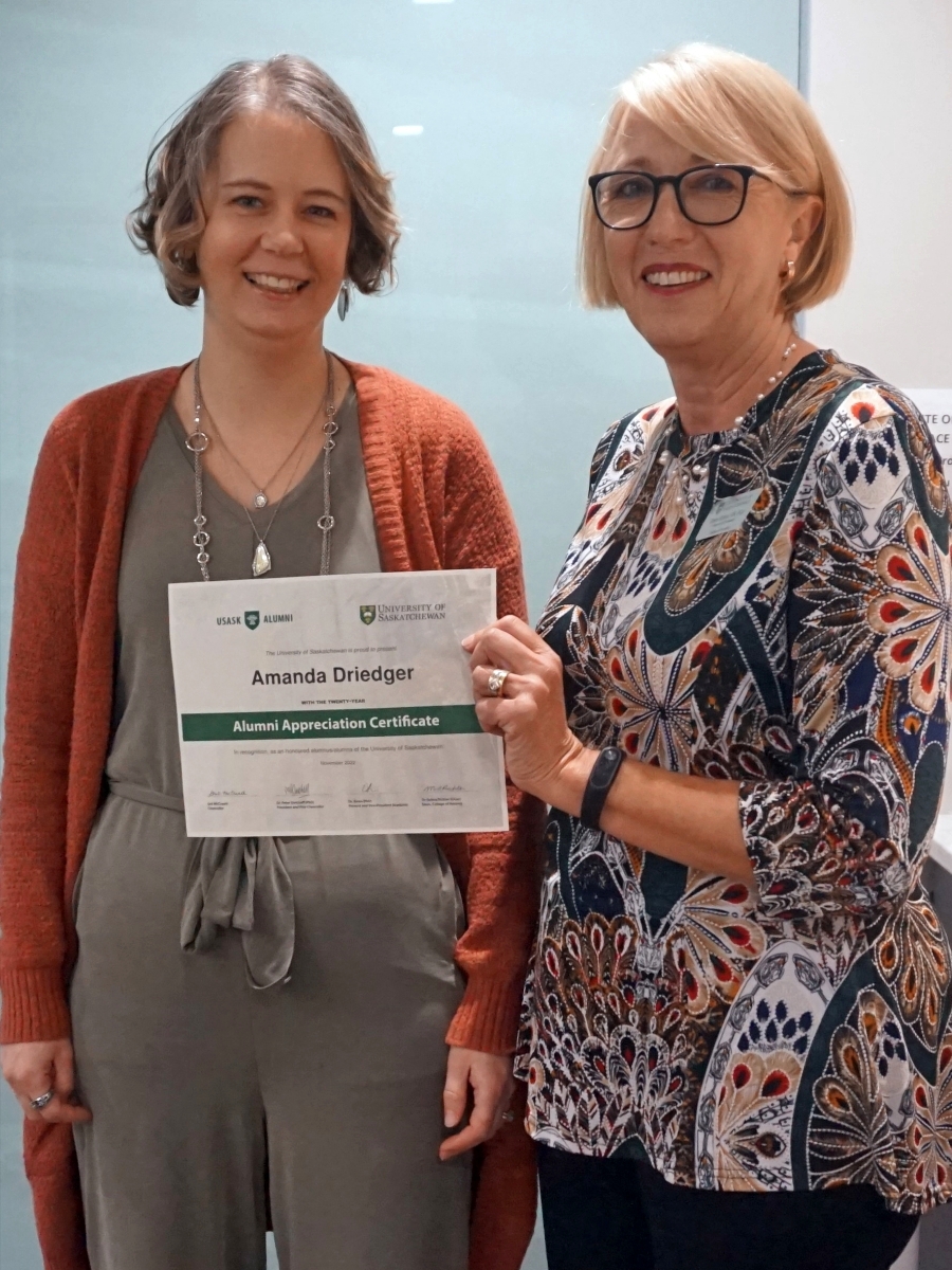 Amanda Driedger and Dean Solina Richter smiling in front of a glass wall, holding an Alumni Appreciation Certificate