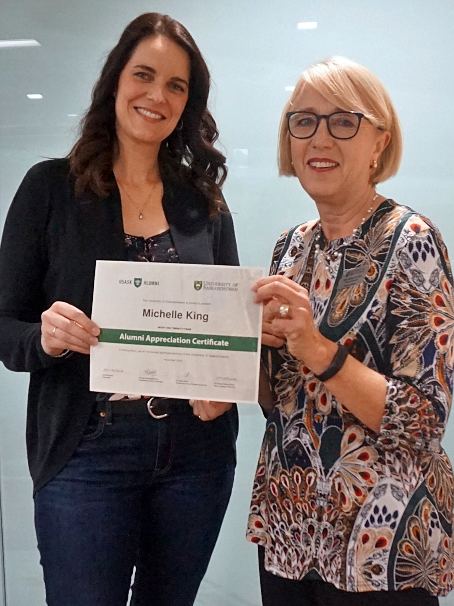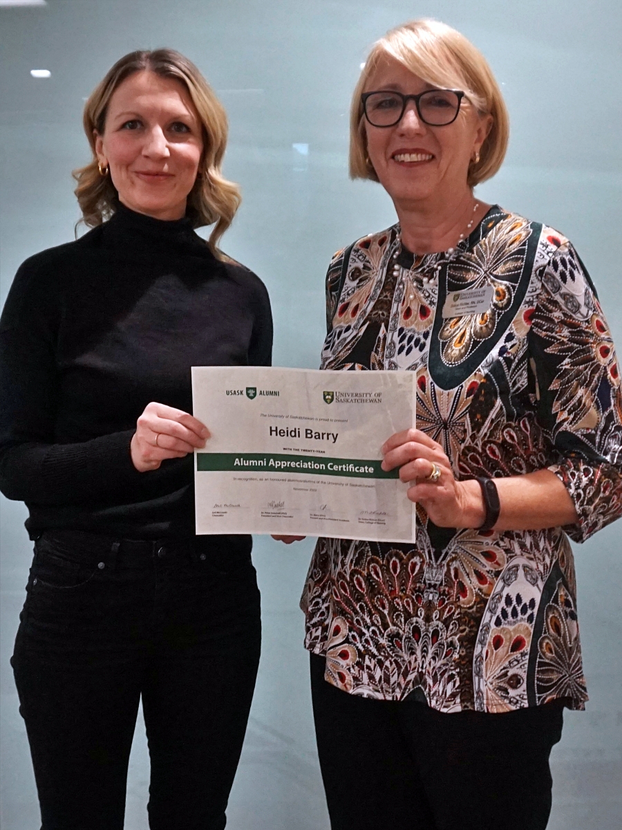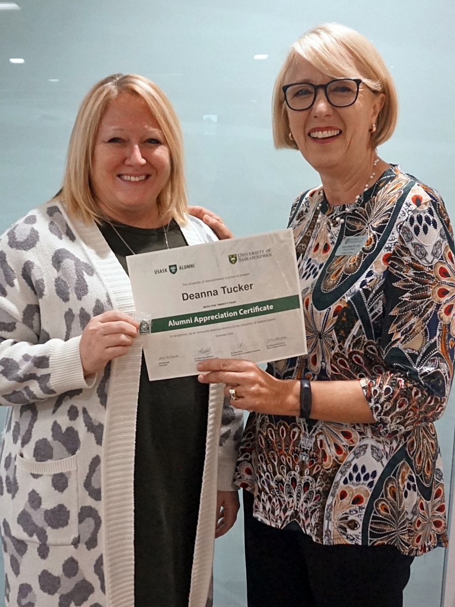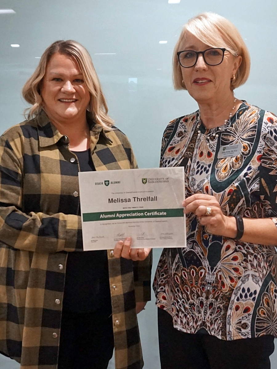 Amanda Driedger and Dean Solina Richter smiling in front of a glass wall, holding an Alumni Appreciation Certificate