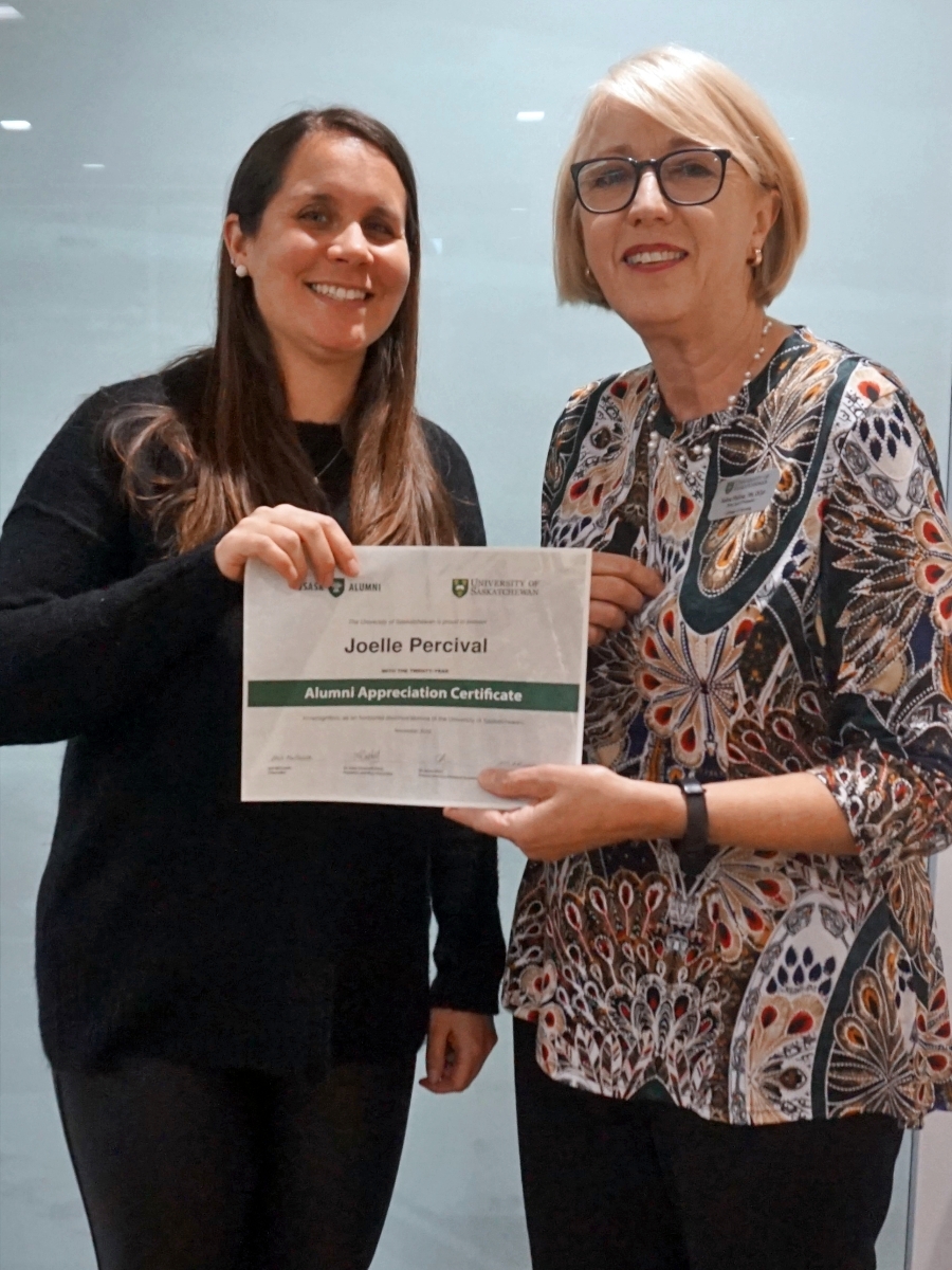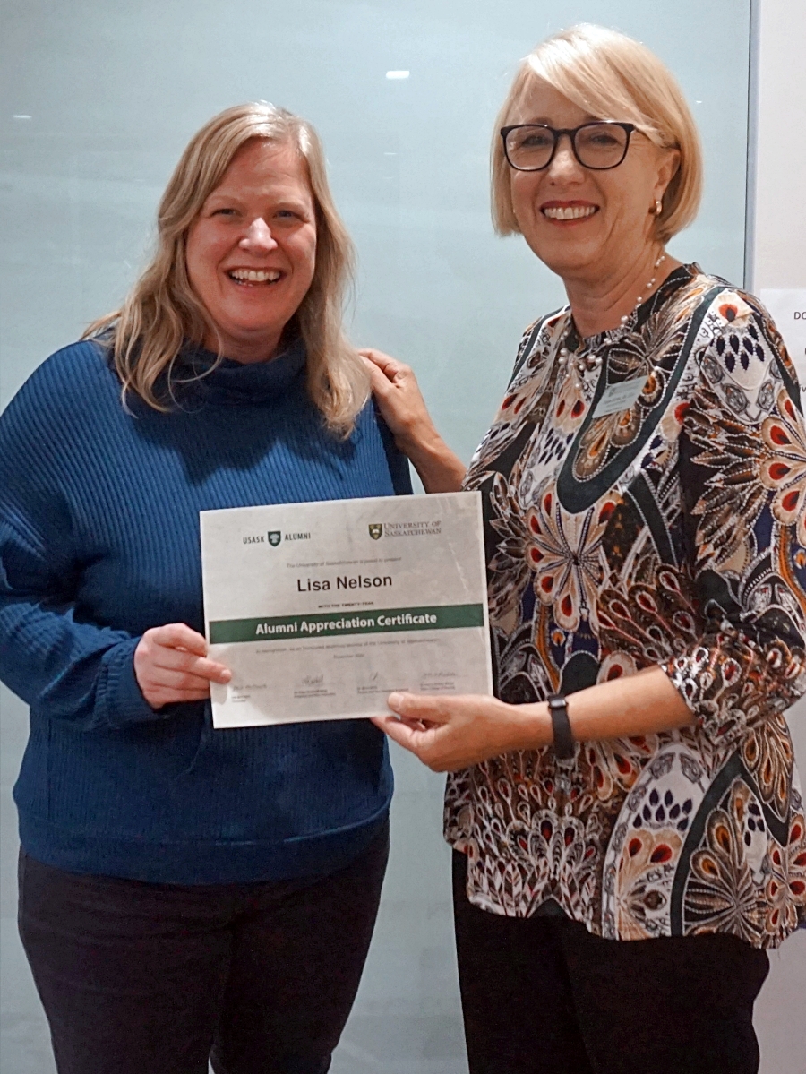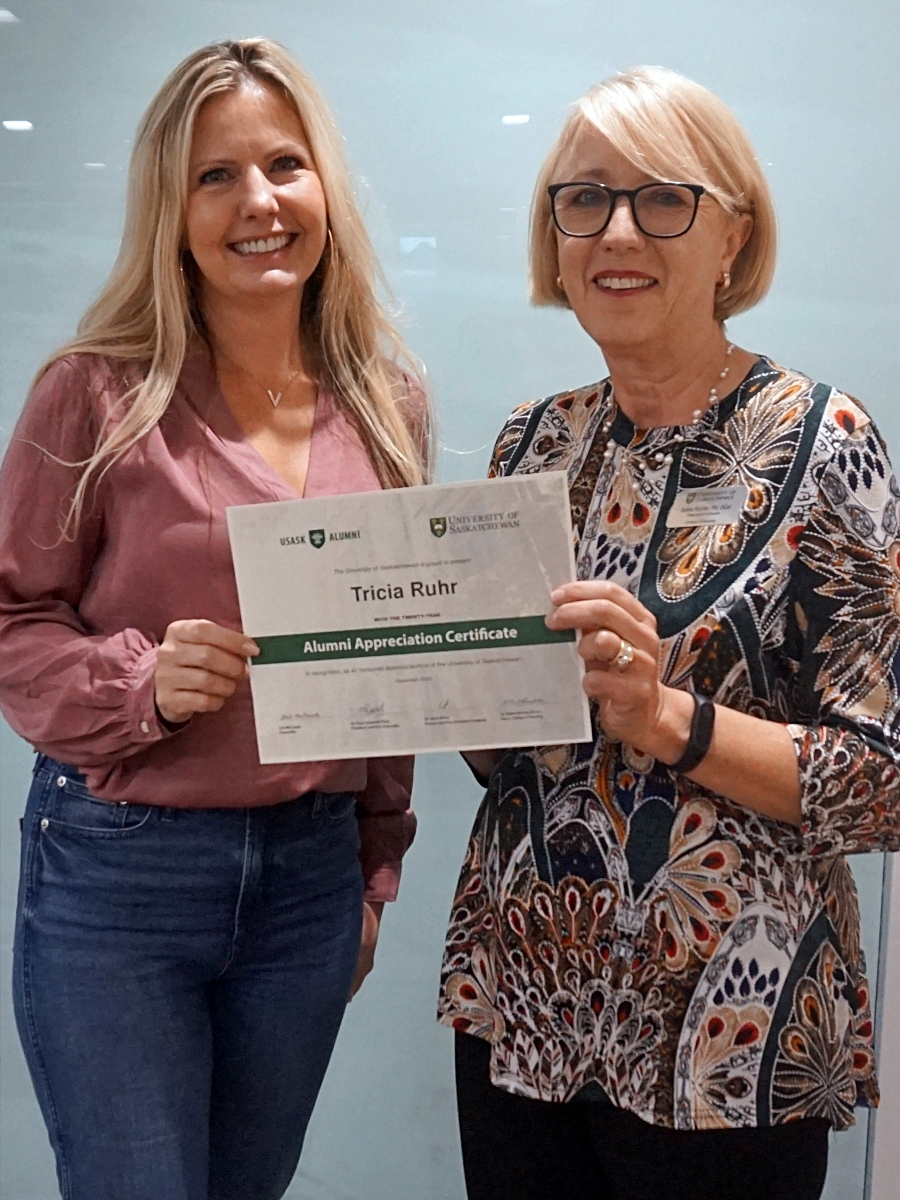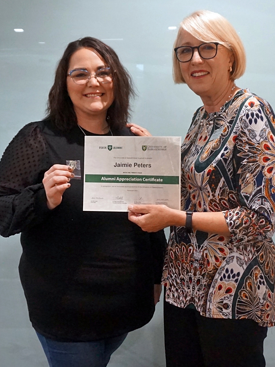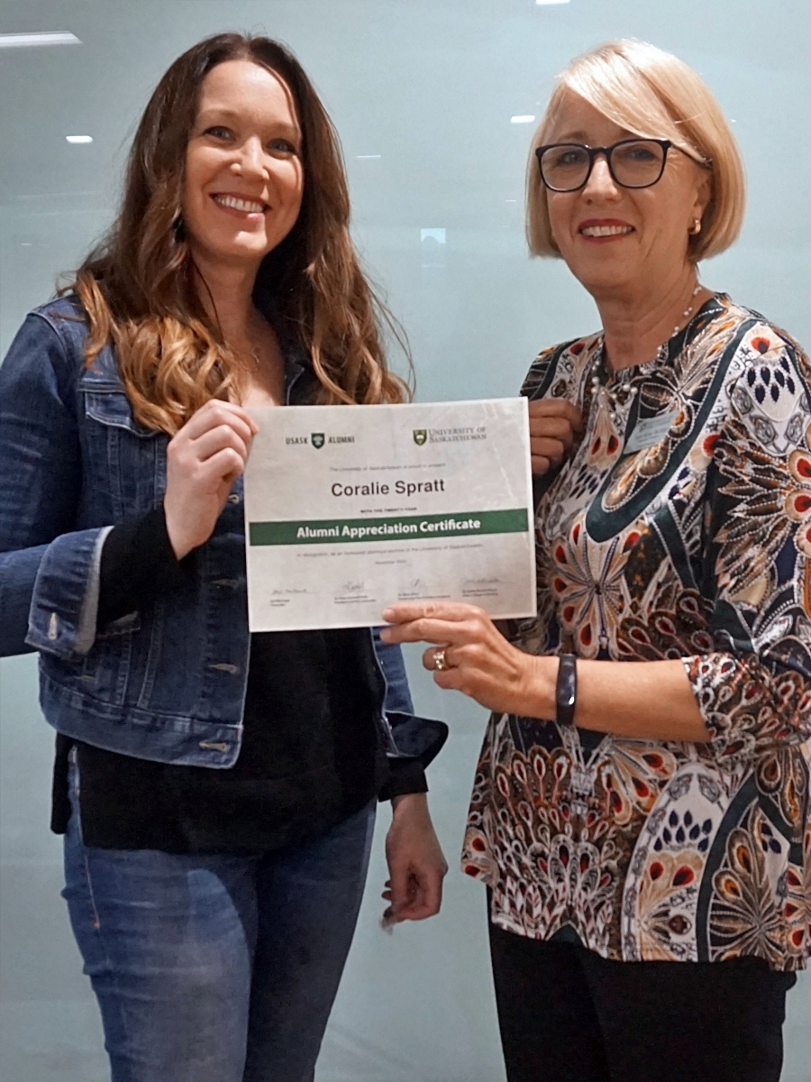 Amanda Driedger and Dean Solina Richter smiling in front of a glass wall, holding an Alumni Appreciation Certificate