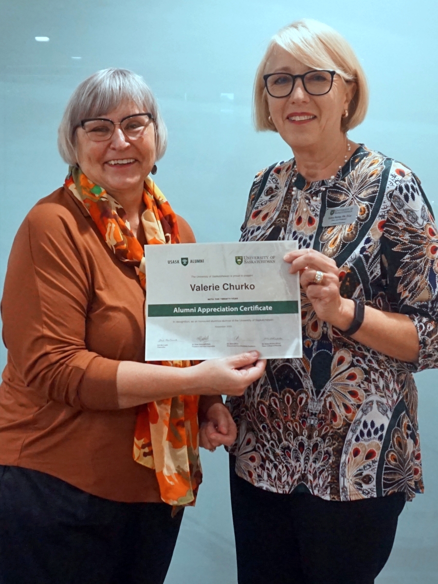 Valerie Churko and Dean Solina Richter smiling in front of a glass wall, holding an Alumni Appreciation Certificate
