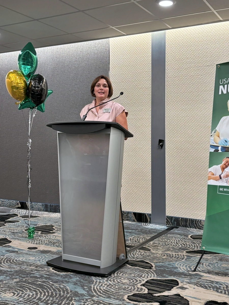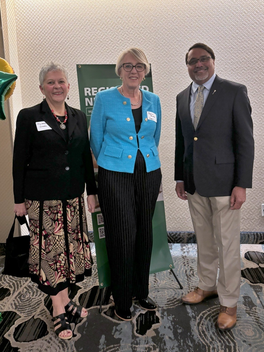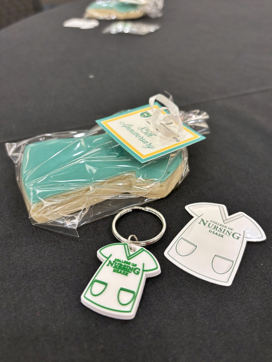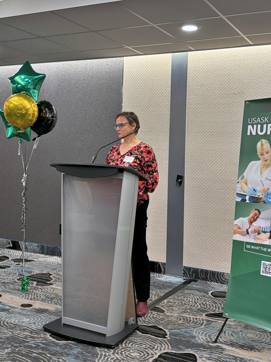 Solina Richter holding a piece of art that says USask Nursing wahkohtowin, standing between four women