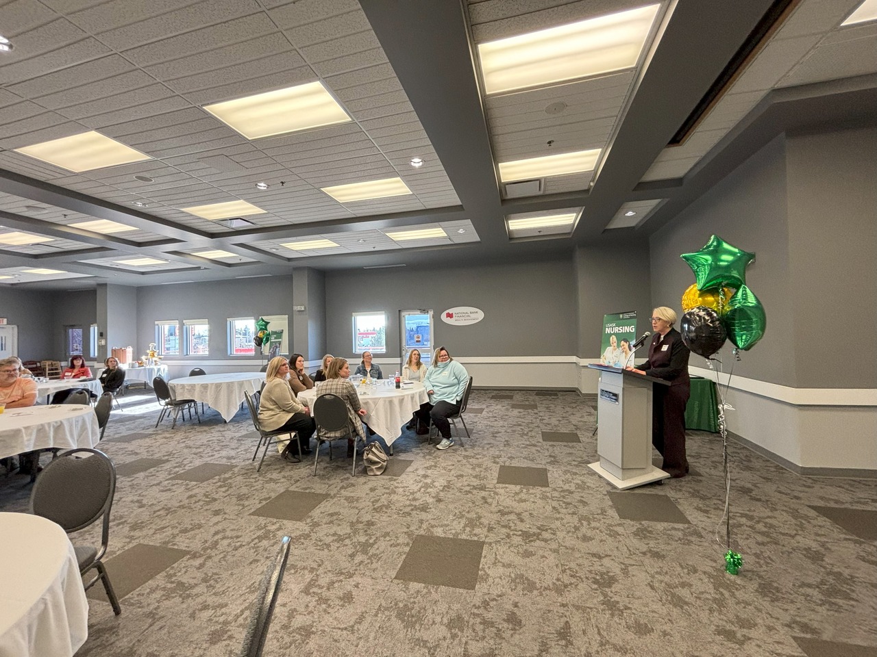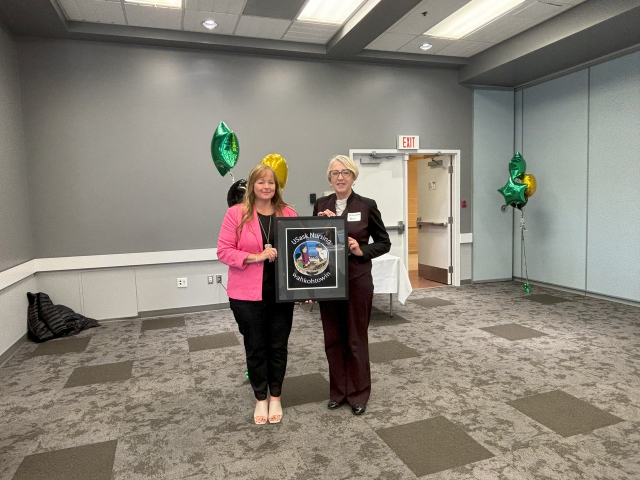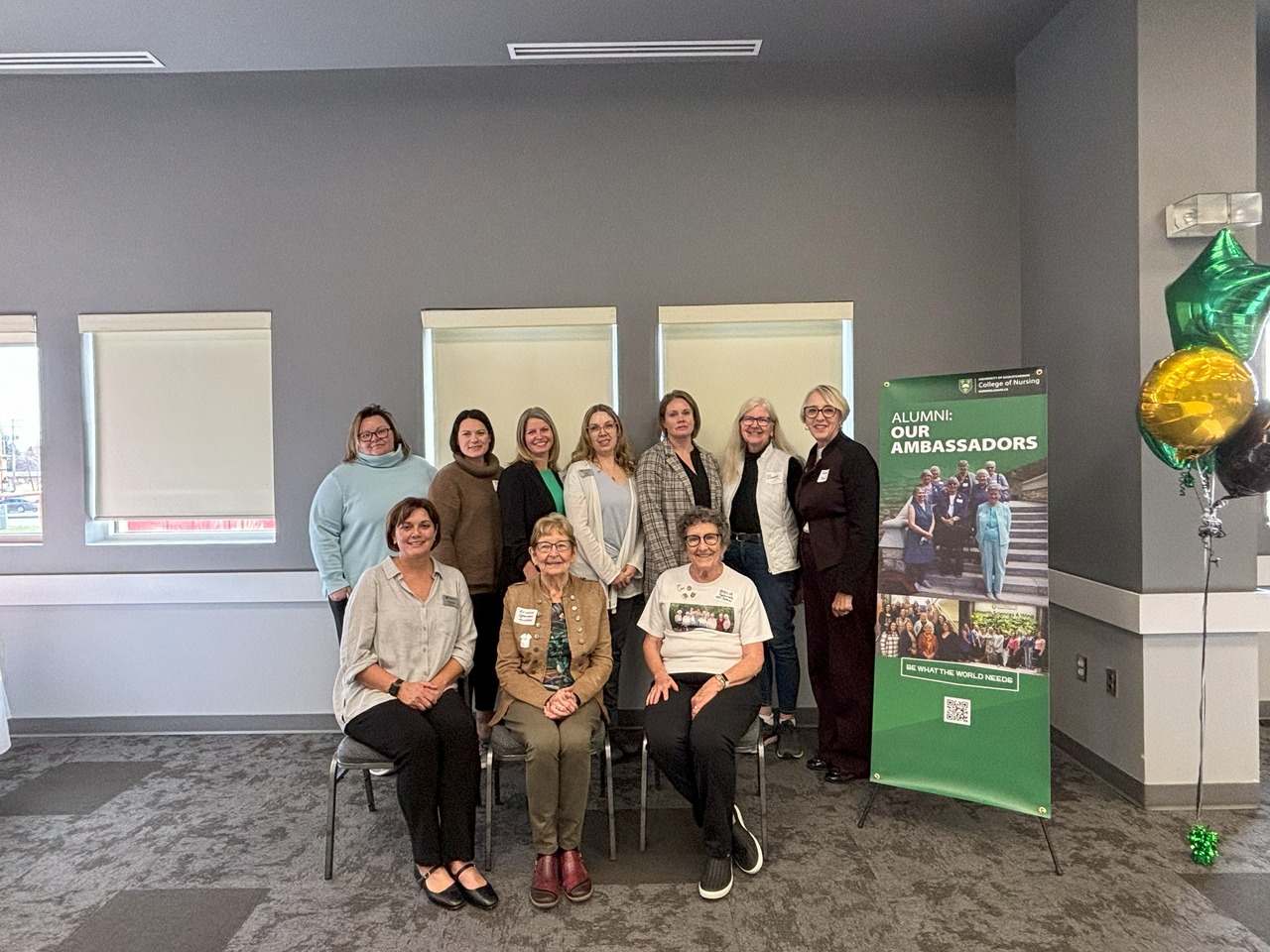 three seated women in front of six standing women, standing beside an Alumni: Our Ambassadors pop-up banner