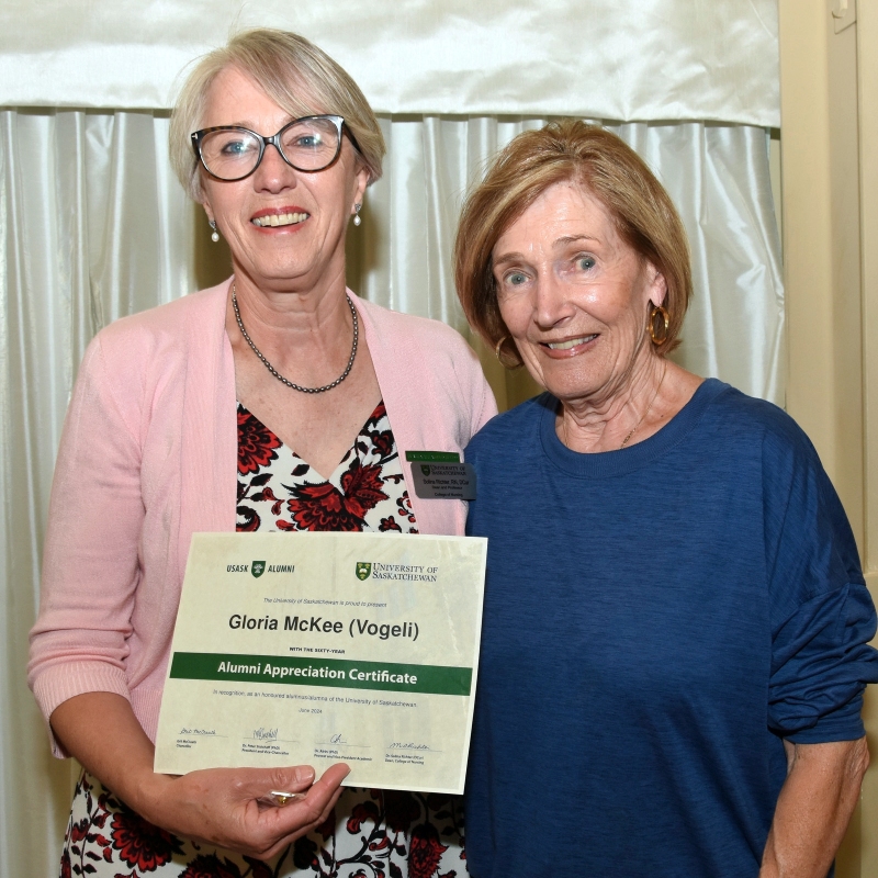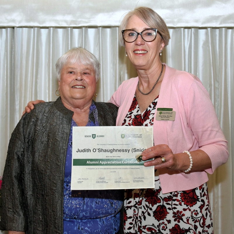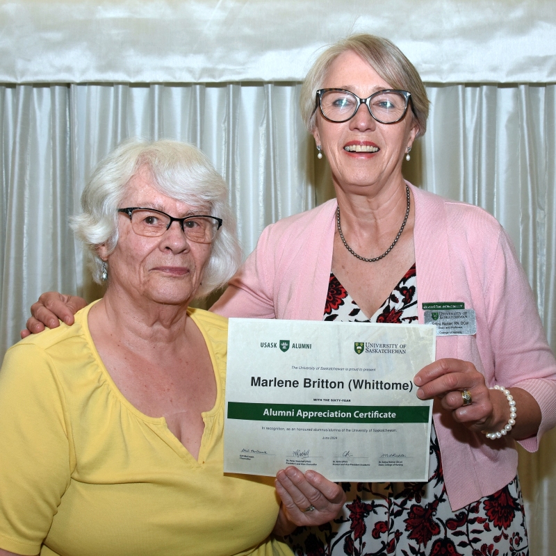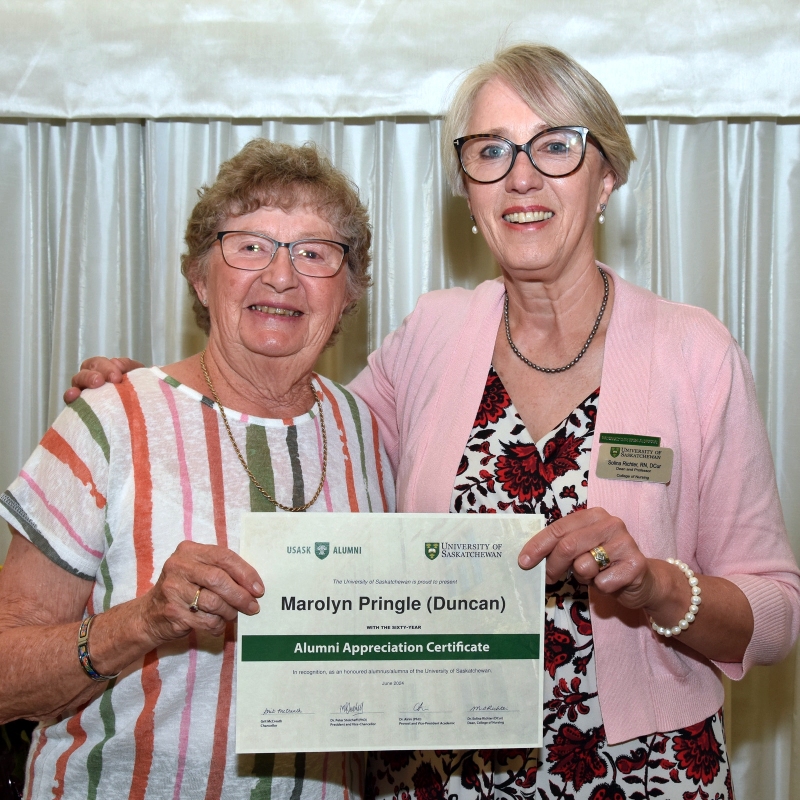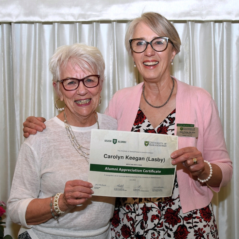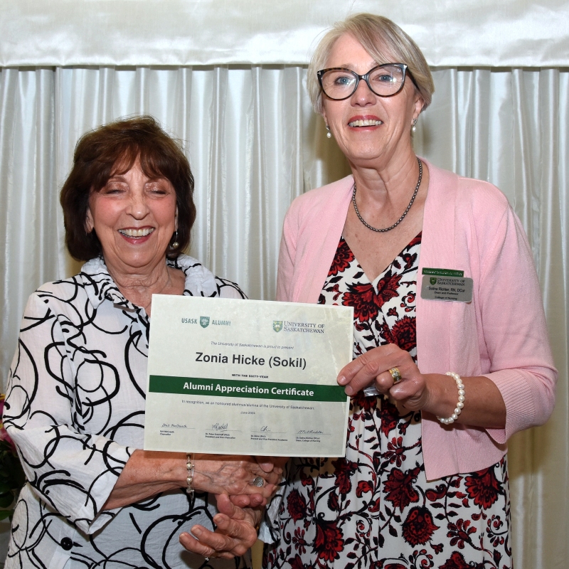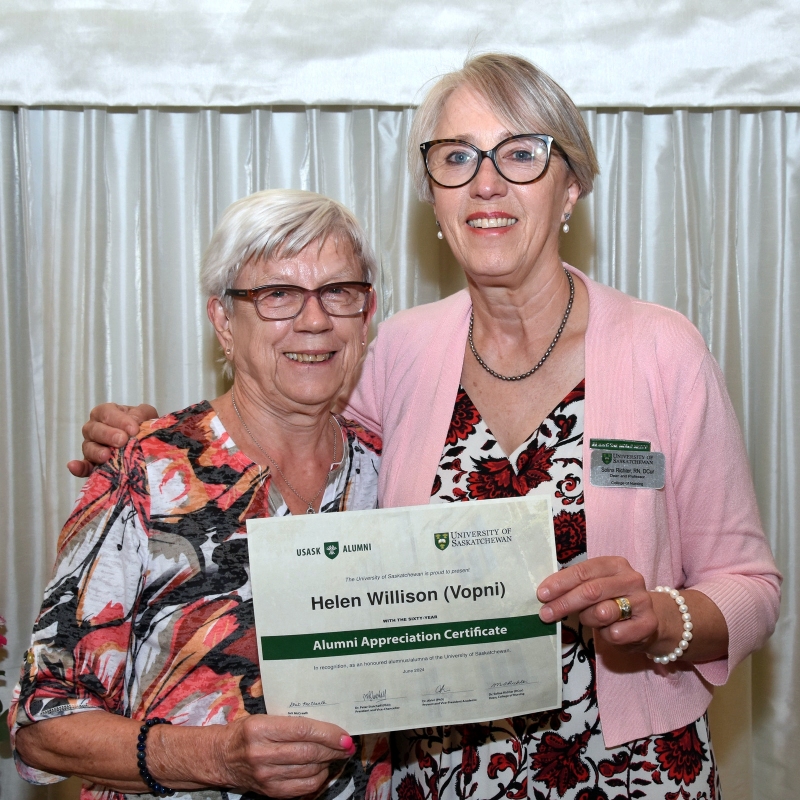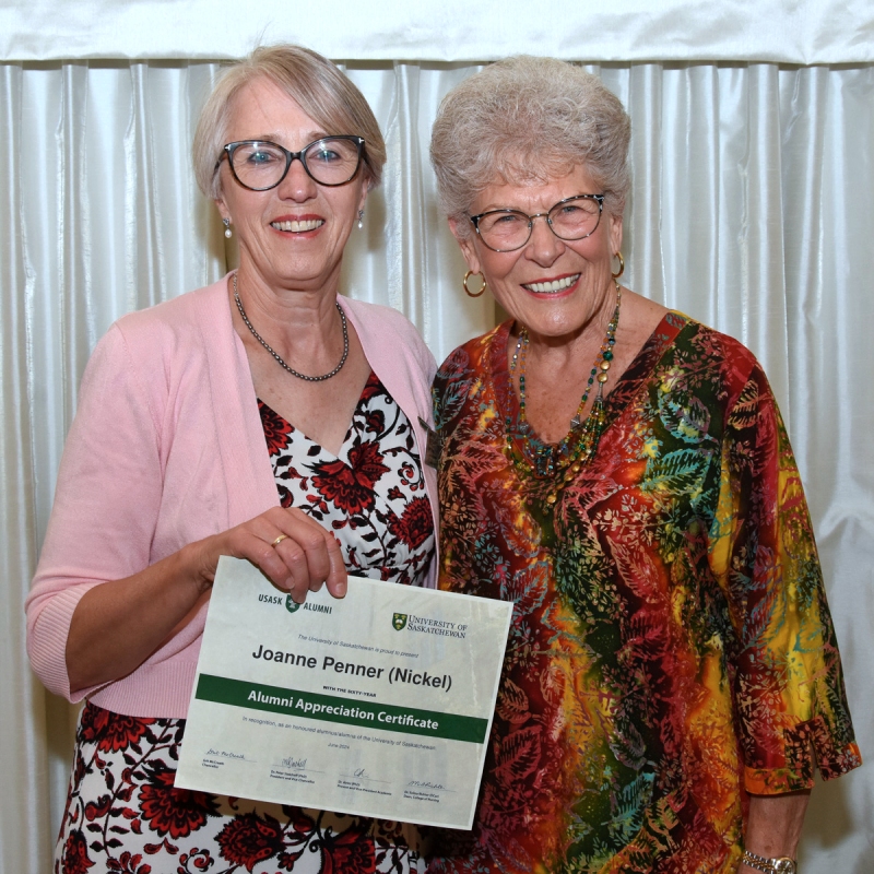 Joanne Penner and Solina Richter smiling for a photo in front of an ivory curtain, holding an Alumni Appreciation Certificate